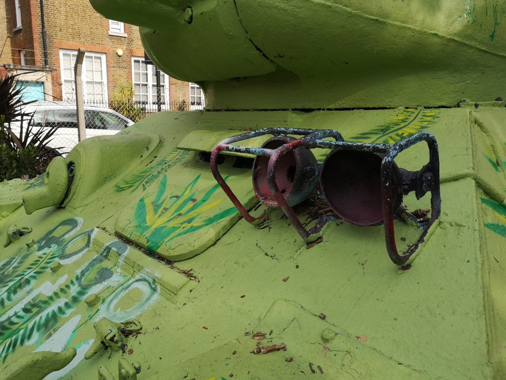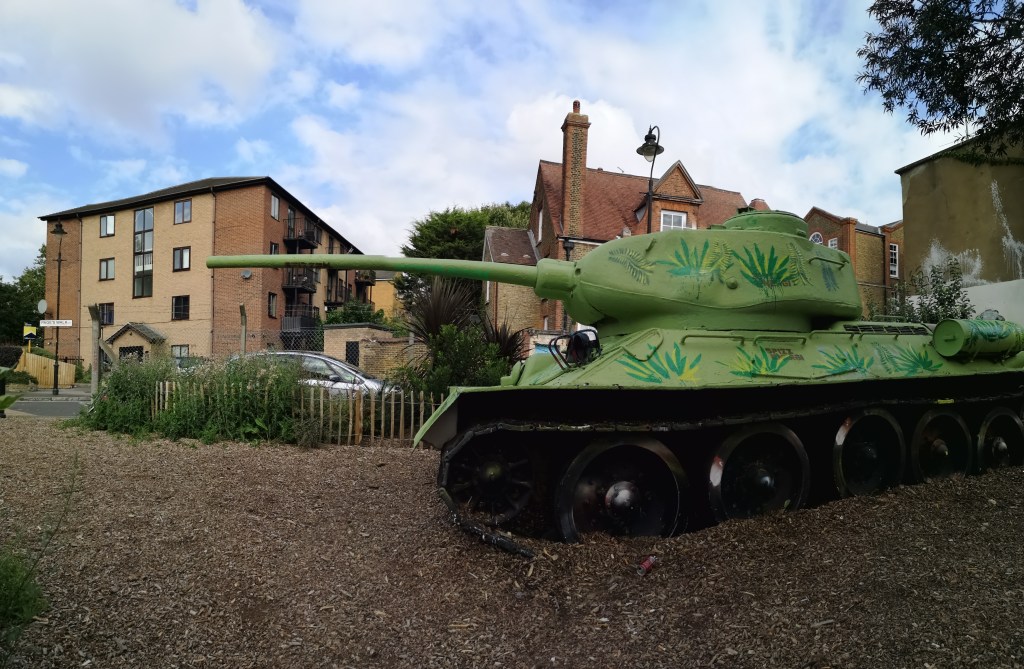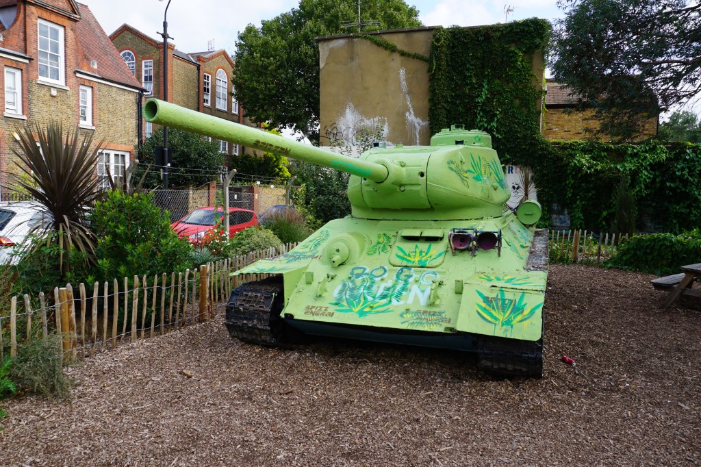 ‘This tank is a former Czech army tank that is said to have taken part in the suppression of the Prague Spring uprising in 1968. Following the “Velvet Revolution” and the dissolution of Czechoslovakia, it was decommissioned and sold, and was used as a prop in the making of the 1995 film Richard III in London. On completion of the film, it was bought in 1995 by Russell Gray, a local scrap dealer, for £7,000 as a present for his son. He had previously failed to secure planning permission from Southwark Council to secure a vacant plot of land that he owned; and so, in an act of humorous protest, he placed the tank on the site, with its gun turret turned towards the council offices. He had previously allegedly obtained permission for the installation of a “tank” there, assumed by council officials to mean a septic tank. The tank is nicknamed after the South African anti-apartheid activist James “Stompie” Seipei.’