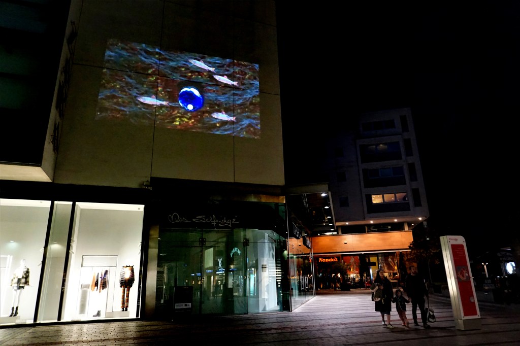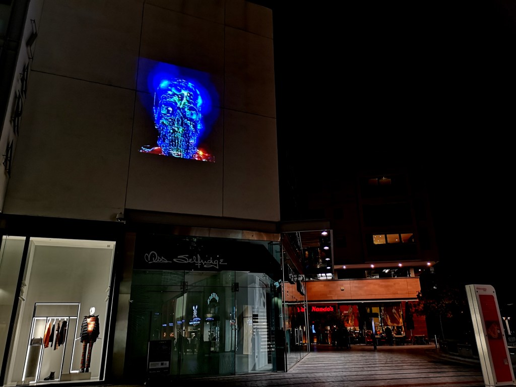 We spent an enjoyable day walking around Exeter, having a meal at The Old Firehouse and watching my son Archie’s Video display in the shopping precinct Princesshay. My son is in his second year at Exeter College studying film, camera and moving image. The Royal Albert Memorial Museum has put on an external display showing off their wide range of displays and artefacts, this has been a commission for an artist and students of Exeter College. I’m quite impressed.
