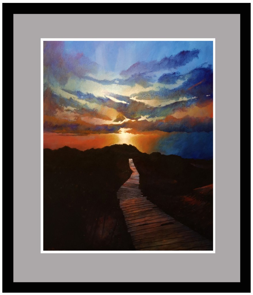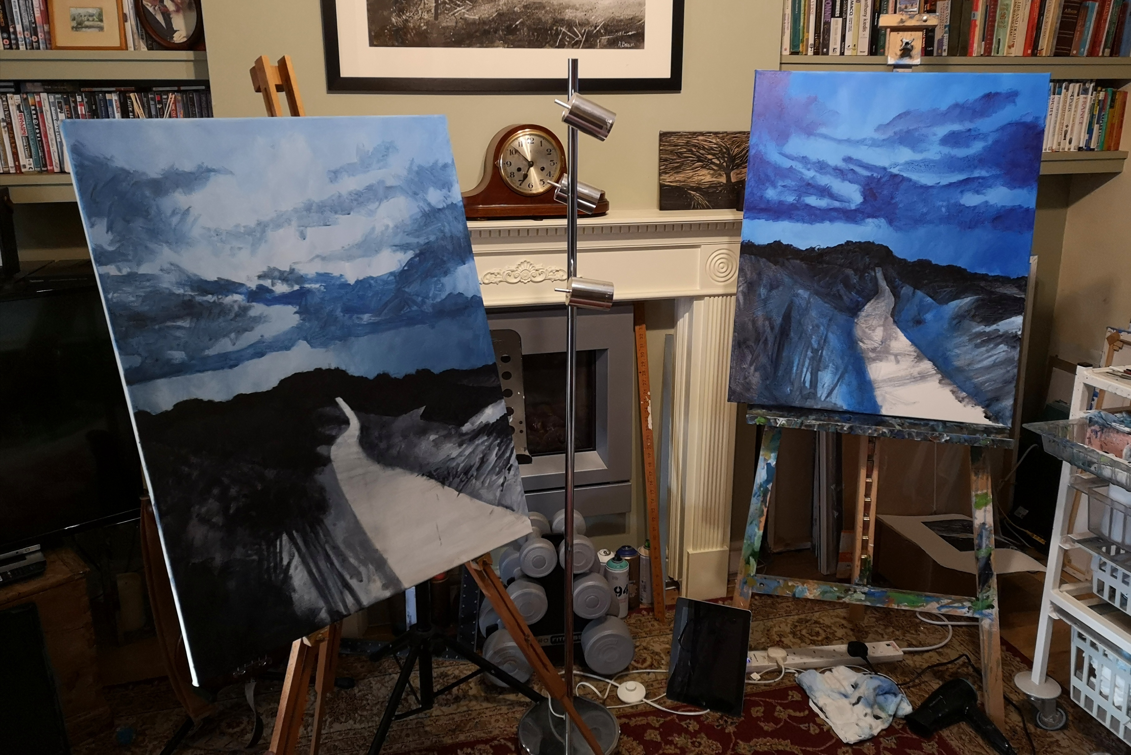 Troubled Sunset At Crow & Sundown At The Point 24 x 30″ acrylic on canvas. I had a terrible dream about waking up in the night and hearing repetitive thumps in the dark. I looked out and could see distant nuclear mushroom clouds glowing on the horizon it was Russia’s last gambit. In the dream I nudged my wife and said that I loved her and our time had come! After photo-montaging and adjusting several of my images the outcome is the preliminary image above. I tend to work with Adobe on my laptop or Procreate on an iPad and work up the images, a kind of preliminary sketching before finally stabilising the final image! Now to the canvas and paints.