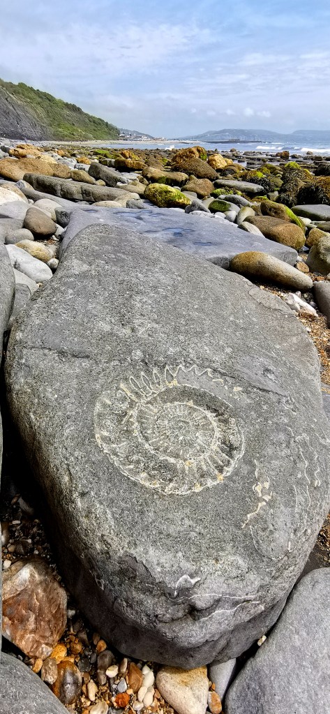My wife Donna had a jewellery making course in Colyton in Dorset so I decided to tag along and then travel on to visit Lyme Regis and hunt for some ammonite fossils. The weather was rather cloudy but soon the sun came out and I edged my way along the pebbly beach, dodging the outgoing tide’s waves. It was wonderful looking at the ammonite fossils in the large rocks and there is an area where they carpet the whole area. With my geological hammer I managed to find some fossils along with a special ammonite preserved in quartz crystals. To add to the day a Chinook Helicopter flew up and down the coast a few times, I’m sure the pilots had a great view over the Dorset Coast.