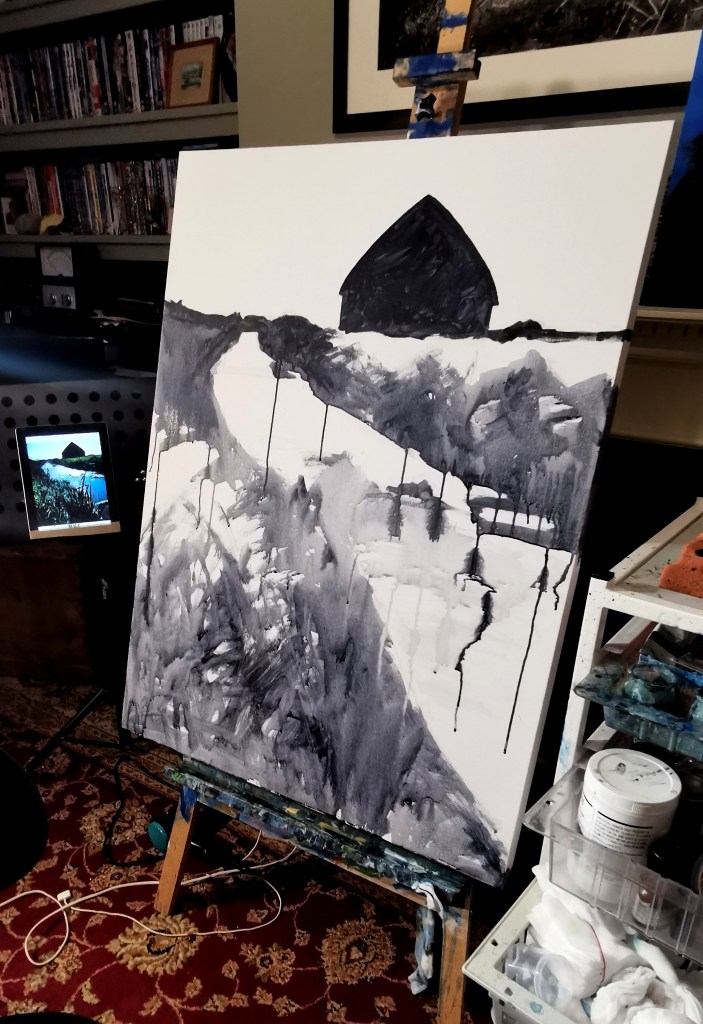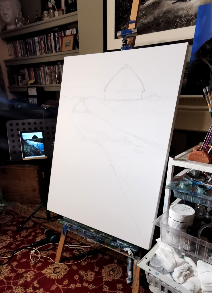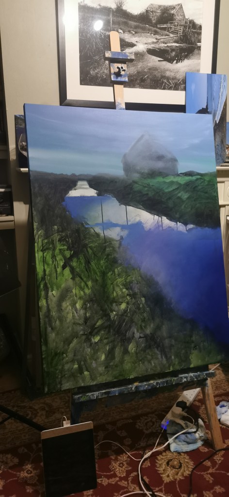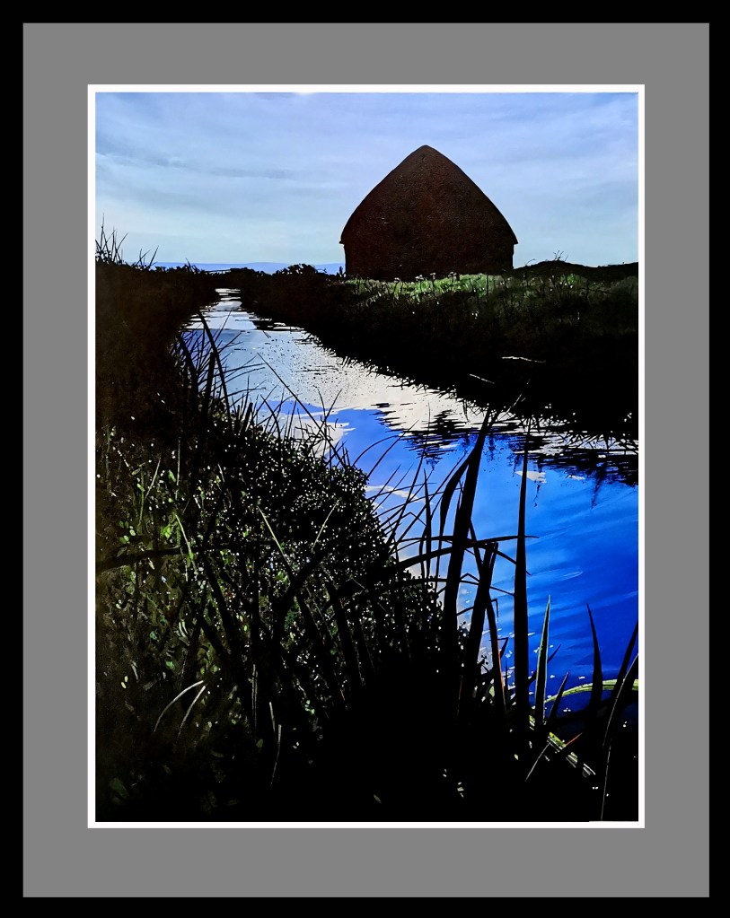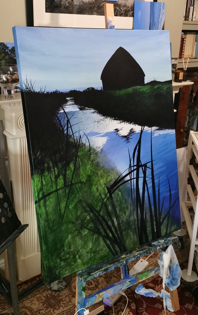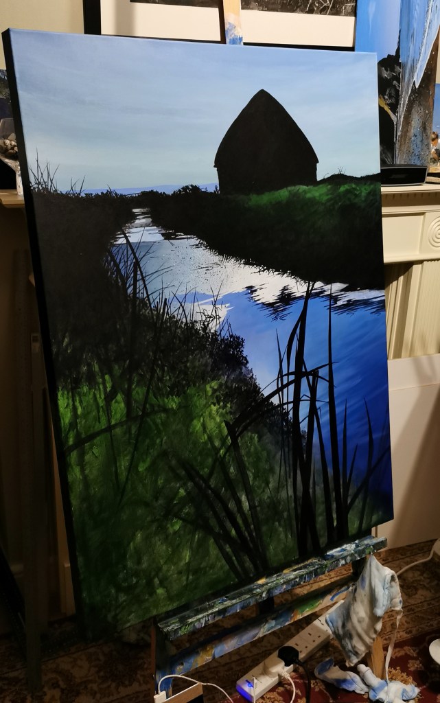 A return to an old favourite of mine and perhaps the final painting of 2022. The old linhay on the Marsh in Braunton. Acrylic on canvas 30 x 40″. A sketch of this scene was made during one of my cycle rides along the Tarka Trail, around the Braunton Marsh and down the old American Road to Crow Point. I was quite taken by the neon cold light this particular morning and sat in the reeds watching the sticklebacks and swans.