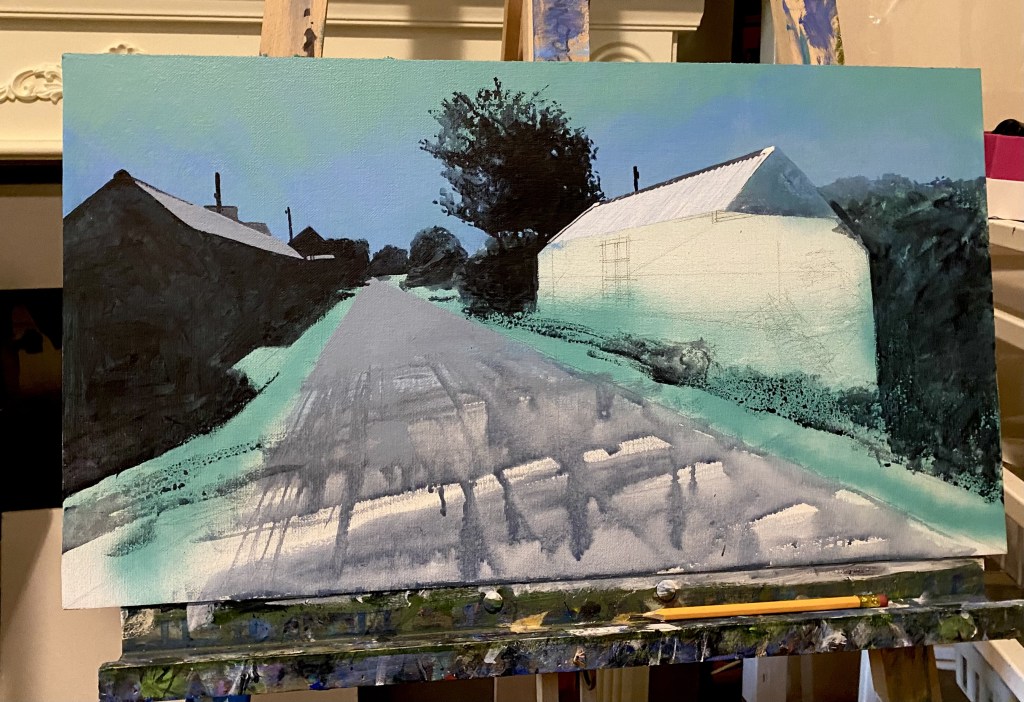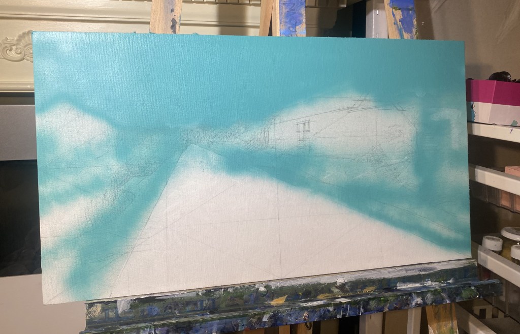 A favourite topic of mine, beach side huts and houses. I’ve started formally with some loose perspective guidelines and added some acrylic spray can paint to remove some of the initial white of the gesso! Acrylic on hand made canvas panel, 13 x 24″ in old money!