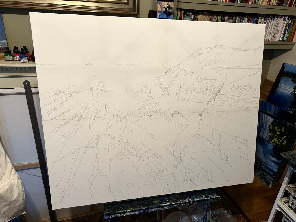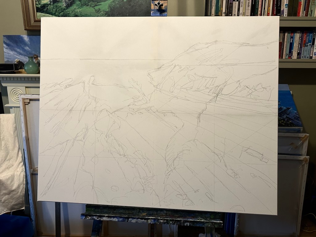 Basic sketch down so now some base colour will be applied. Base colours are now loosely sketched in to begin and define the composition. Bringing up the entire canvas is so important for continuity.
