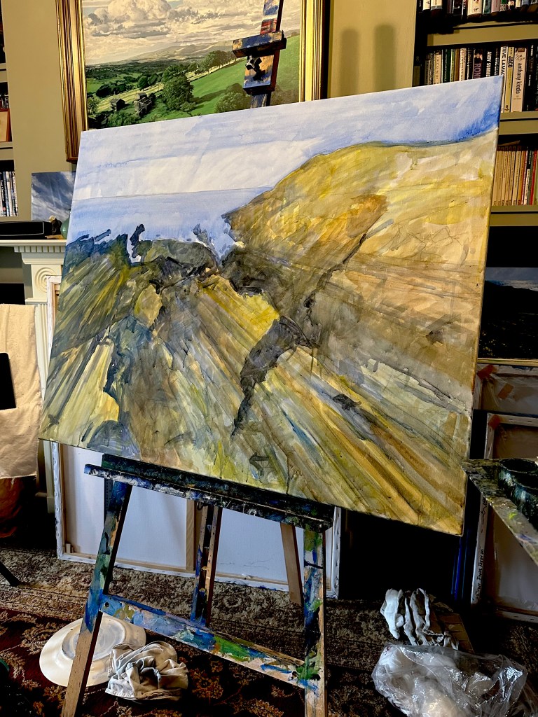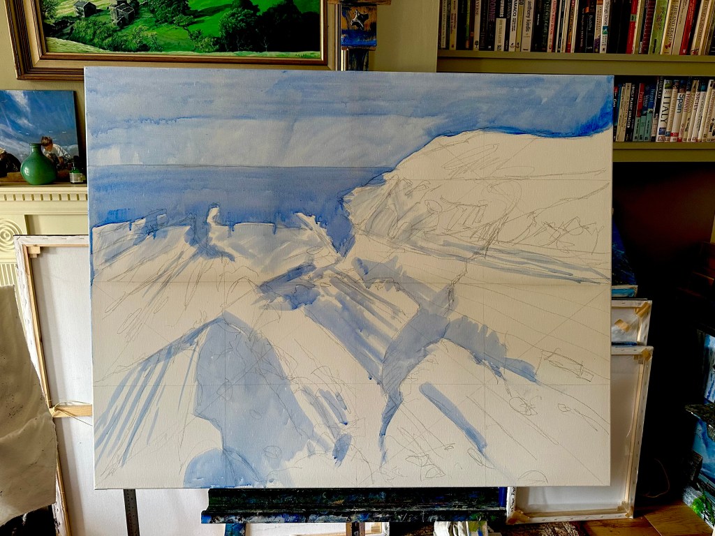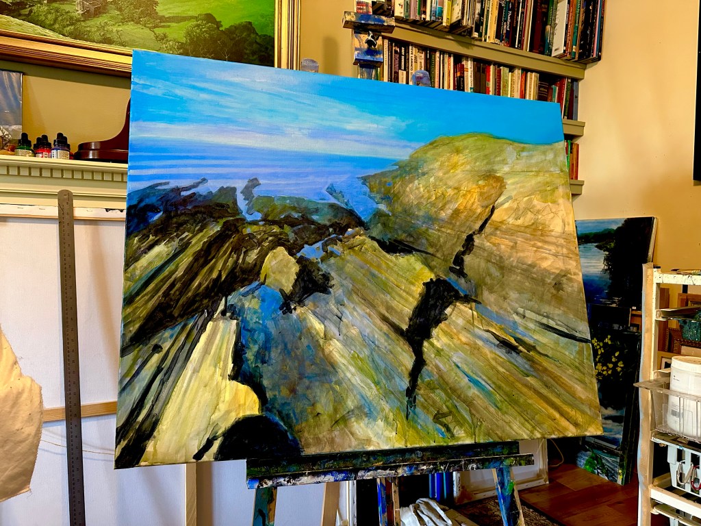 An experiment using quite a coarse canvas. It is of a view looking out of Saunton Sands from a lay-by on the hill. Acrylic on 720 x 350mm canvas.