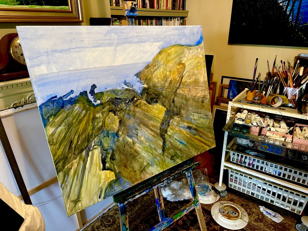 On Thursday evenings it’s cold water swimming so this week due to the high tides we swam at Instow. The water was surprisingly warmish so we spent an enjoyable 25 minutes chatting and enjoying a memorable sunset from the water. This is an impression of what we saw that evening! Acrylic on 16 x 24” gesso panel. Al