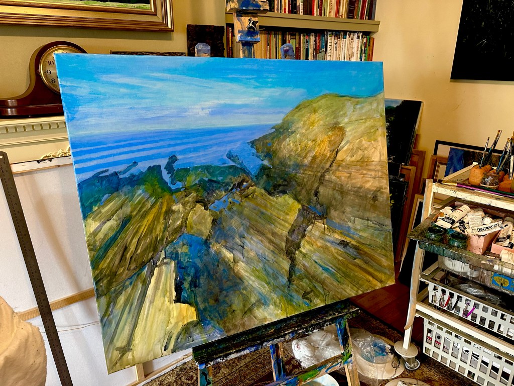 An acrylic on 32 x 24” canvas of a spectacular cove near Combe Martin in North Devon. It has been referred to by many as, ‘The Happiest View In Britain.’ Sadly the very steep cliff path down to the beach has subsided so access at the moment is by water only.