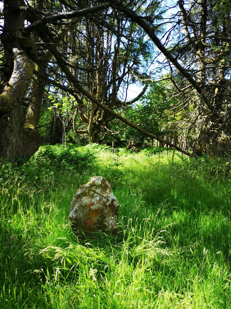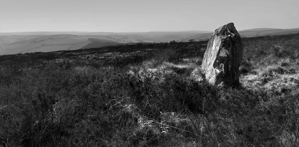 We spent an enjoyable day visiting the Somerset side of the Exmoor National Park spotting deer and searching out cream tea rooms. We visited Selworthy, it’s Beacon and the Periwinkle Tearooms, then travelled on to the The Horner Tea Gardens for more indulgence. Full of cream and jam we decided to visit the Culbone Stone on our return home. Just off the A39 between Oare and Porlock there is a small junction which leads to a permissive path leading to the Culbone Stone. This mediaeval stone which has a Christian wheeled ring cross carved into it by and early Christian community about 1,200 years ago. It is approximately 3′ high and 20″ wide, and it’s style suggests it dates from perhaps the 6th or 7th century. This stone was discovered on it’s side at about 1939 and then placed upright where it was found, it is thought to be part of a long Neolithic stone row erected 3000 years ago which resides close by in the same wood. The earie wood, it’s ghostly trees and hanging moss suggests magical and mystical properties and has been suggested that St Beuno may have preached there. We searched for the stone row for some time but sadly gave up stumbling around through brambles, tics and dense bracken. Below the exmoorher.co.uk link gives a much better location for this row.