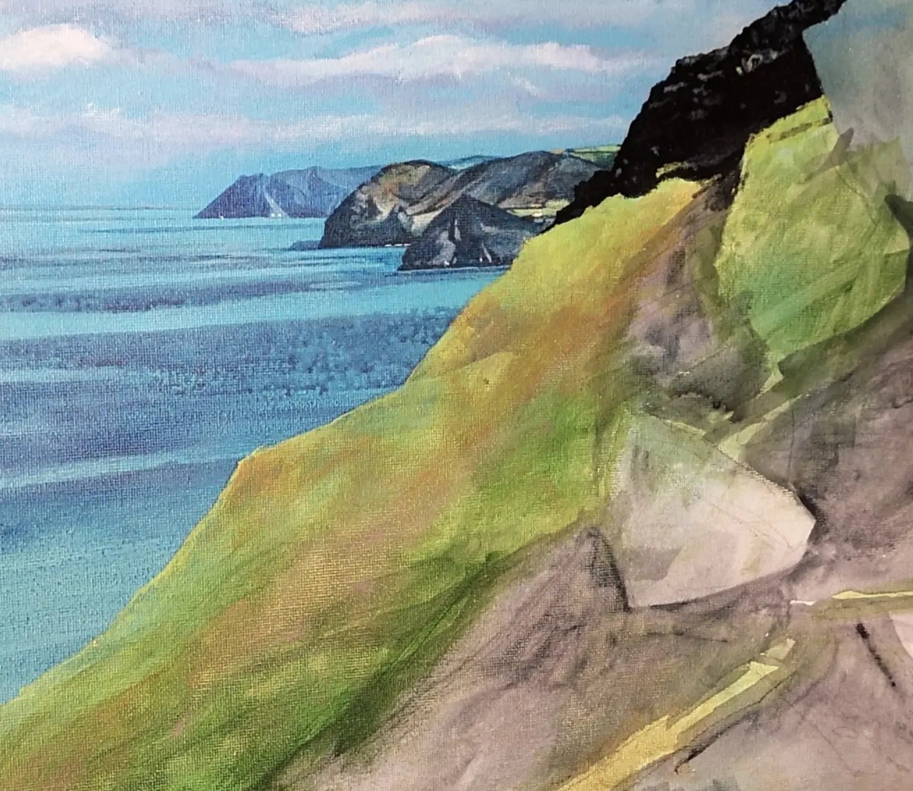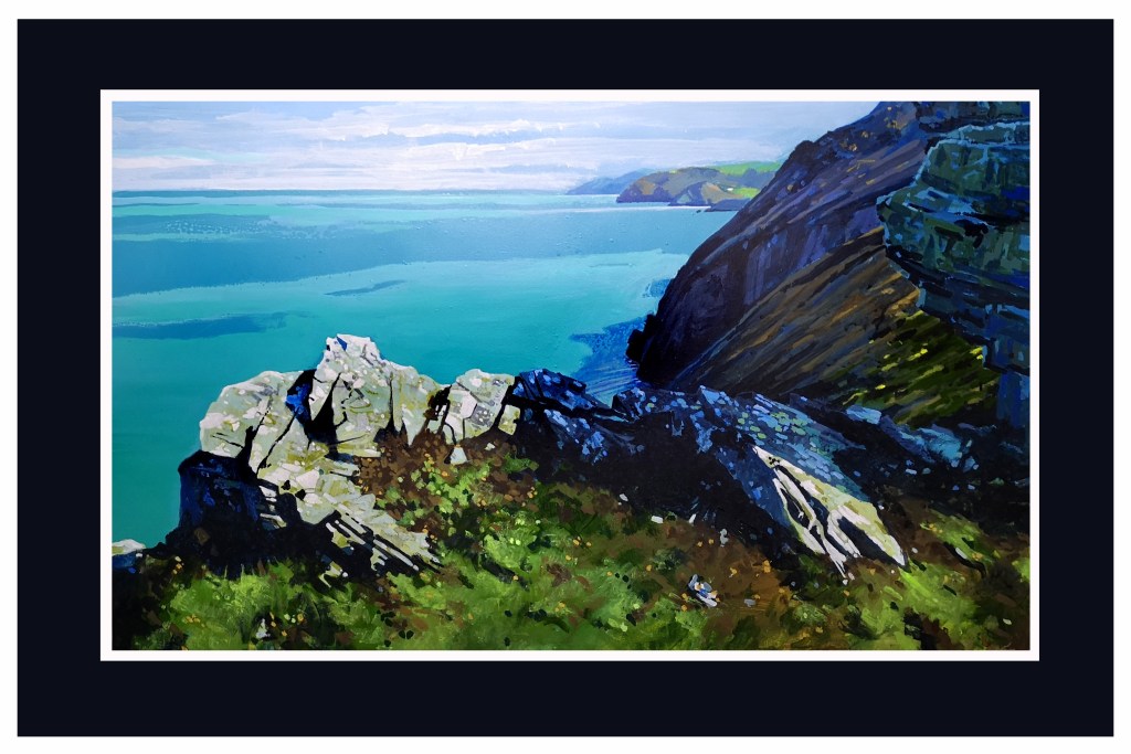 An acrylic painting inspired by a walk down to Heddon’s Mouth from Hunters Inn. We walked North up along the South West Coast Path from the Heddon Valley and had a picnic there amongst the rocks enjoying the views up and down the North Devon Coast. This view is looking toward Crock Point, Lee Abbey, Valley of the Rocks and in the distance Countisbury. 750 x 500mm acrylic on canvas.