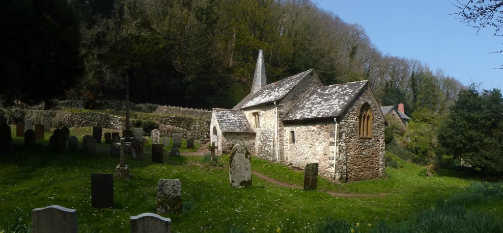 An enjoyable circular 10 mile walk from County Gate to the village of Culbone. It was wonderful to be out walking again along the South West Coast Path. A scenic cliff path walk through densely wooded walkways with tripping streams and open fields dotted with sheep and newly born lambs. We arrived at the village of Culbone and enjoyed a picnic sitting on an old bench in the graveyard of St Beuno Church. St Beuno Church is reported to be the smallest church in England and dates back to the 13 Century a delightful place set within an aged wood, the sunlit graveyard was a delightful way to spend time in the sun. We returned back to County Gate via a higher footpath through farmland disturbing herds of sheep and lambs on the way. Finally we made our way back over the high moor through the County Gate Stones back to our car. Below are a couple of links with regard to this walk. Al