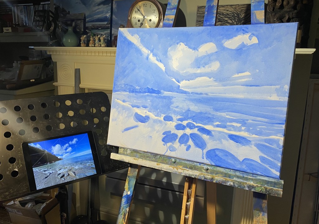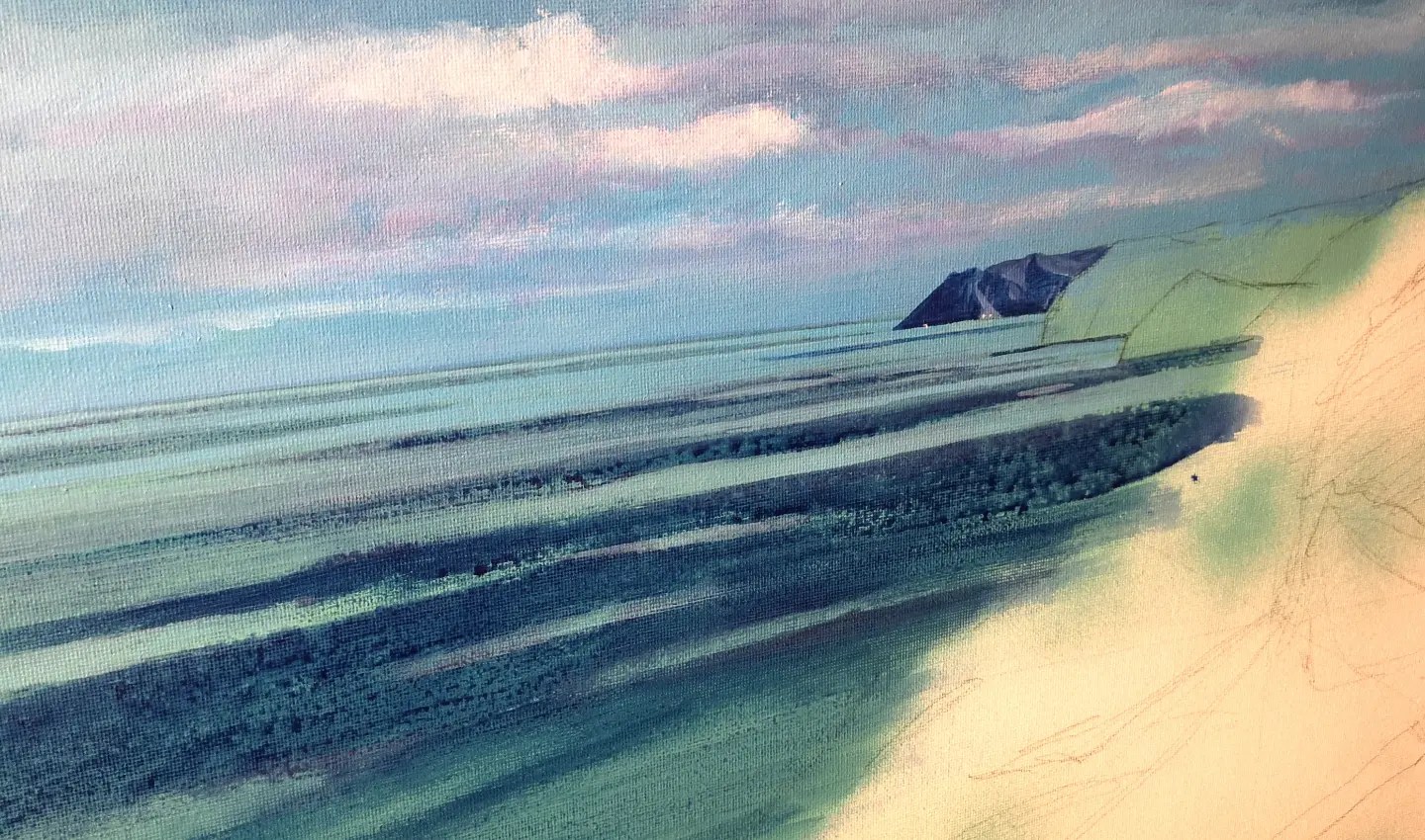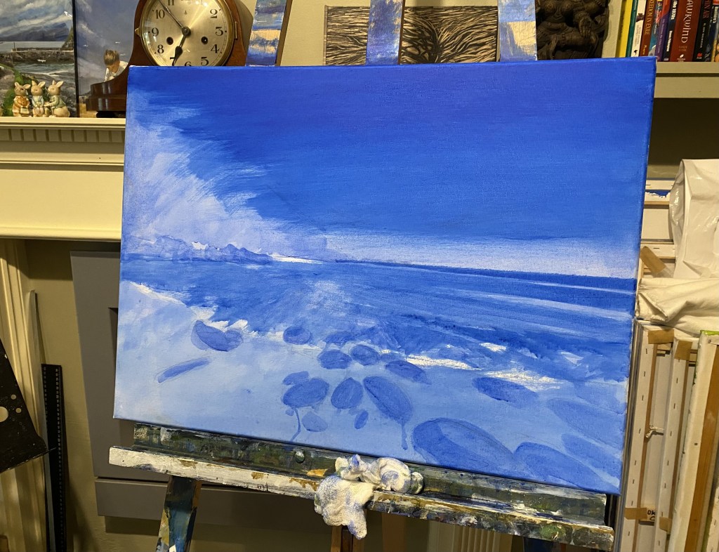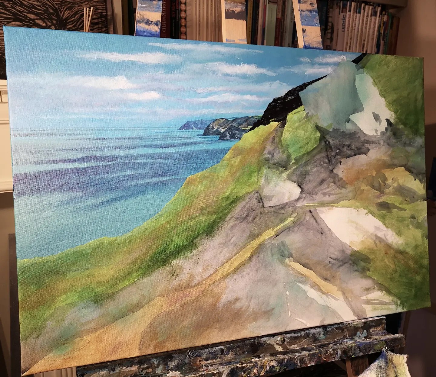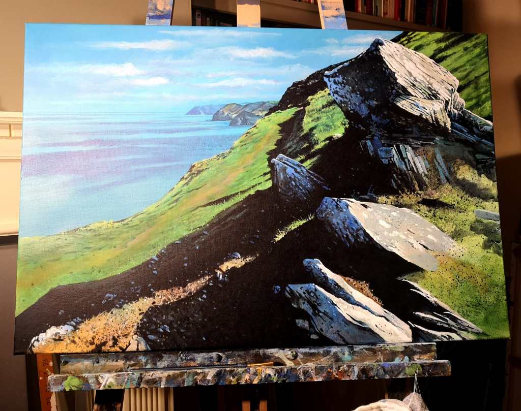 A small acrylic on panel of a section of the South West Coast Path between Heddon’s Mouth and Lee Abbey, 370 x 610mm acrylic on panel. You can see the dot of the Abbey in the distance of this painting in the sunshine. I’ve tried to portray the cool shadows against the warm Spring sunshine and am trying to simplify my brushwork somewhat. We’re looking forward to visiting Hunter’s Inn again when it opens for a few drinks. Al