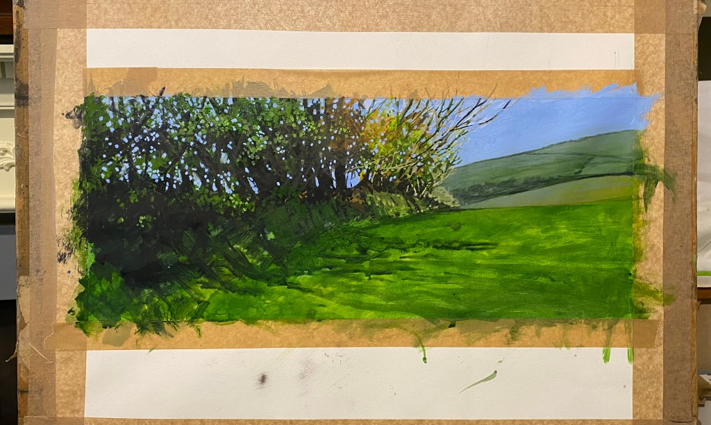 An acrylic sketch on 19 x 8″ cartridge paper a practice in trying to be more free with the paint! I was quite taken by the white slate stones supporting the hedge. I prefer to paint on canvas but this has a certain quality to it!