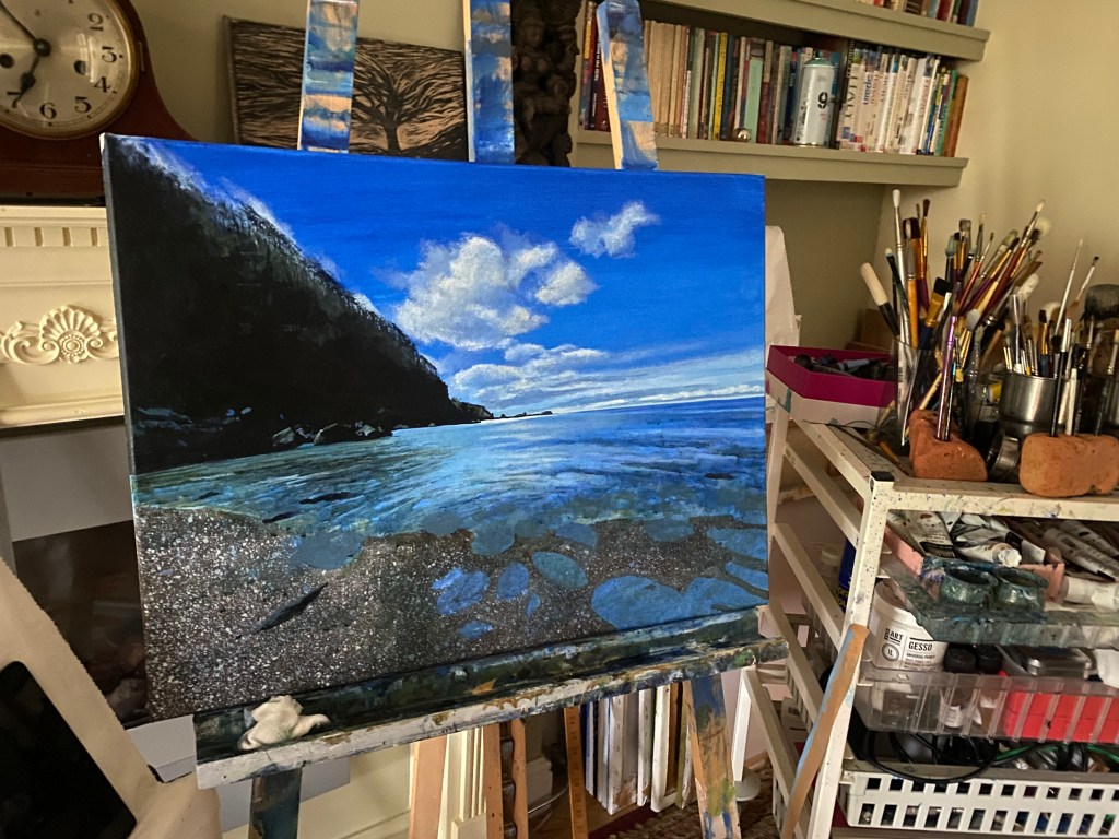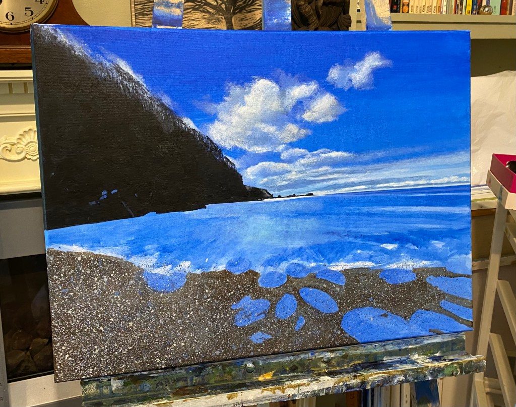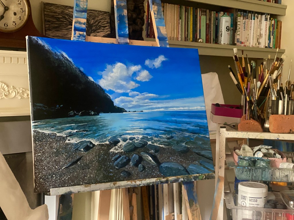 A painting of the wonderful beach bellow Lee Abbey in North Devon, 24 x 18″ canvas. We spent the day here in this quiet cove in the warm spring sunshine. It have a beautiful waterfall cascading as you enter the beach and the views out along the North Devon Coast are stunning. After we had a cream tea at the Abbey Tearooms!