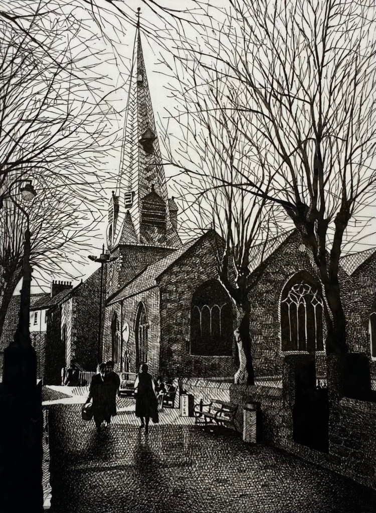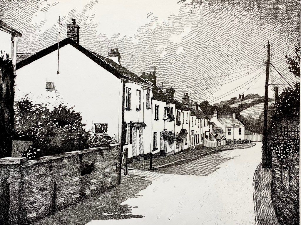 A few old sketchs from my past. Above is a pencil sketch of a Tibetan prayer wheel drawn whilst living in Kathmandu Nepal, this I obtained and now resides in a cabinet in my studio. Below, the first is a pen and ink drawing of where we lived in Bradiford North Devon and on the distant hill you can see the Upcott Folly. The next pen and ink is of Barnstaple Parish Church where my wife and I were married over 37 years ago. The third is of Tarr Steps a medievel clapper bridge in the Exmoor National Park a particular favourite walk of ours. The walk from Withypool to the pub at Tarr Steps is wonderful during the summer and offers opportunities for wild swimming.