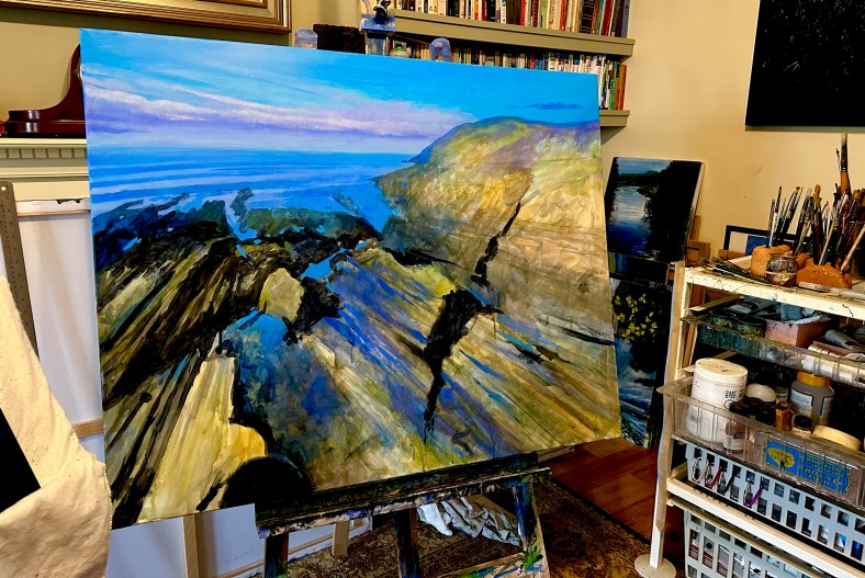 An acrylic on 32 x 24” canvas of a spectacular cove near Combe Martin in North Devon. It has been referred to by many as, ‘The Happiest View In Britain.’ Sadly the very steep cliff path down to the beach has subsided so access at the moment is by water only.