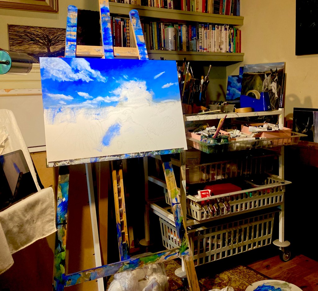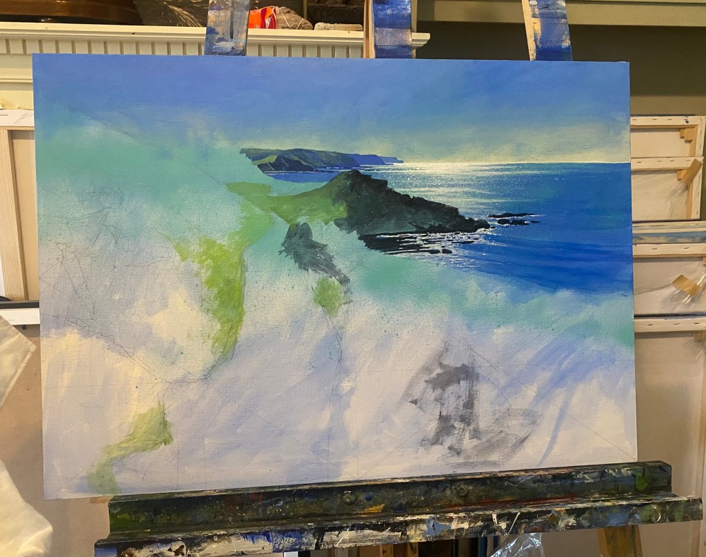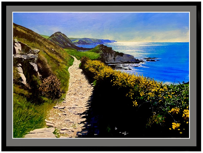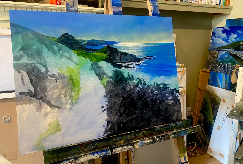 Back to a little landscape of Hartland Quay walking along the coast path to Speke’s Mill on the North Devon Coast. Acrylic on 26×16” canvas.