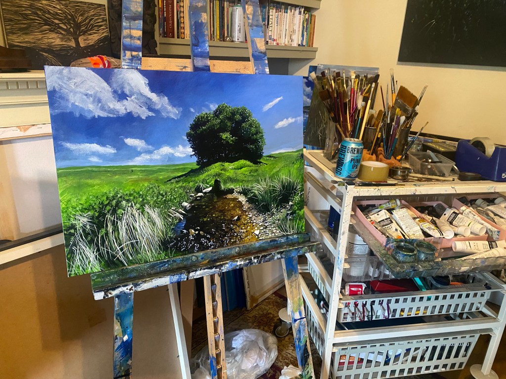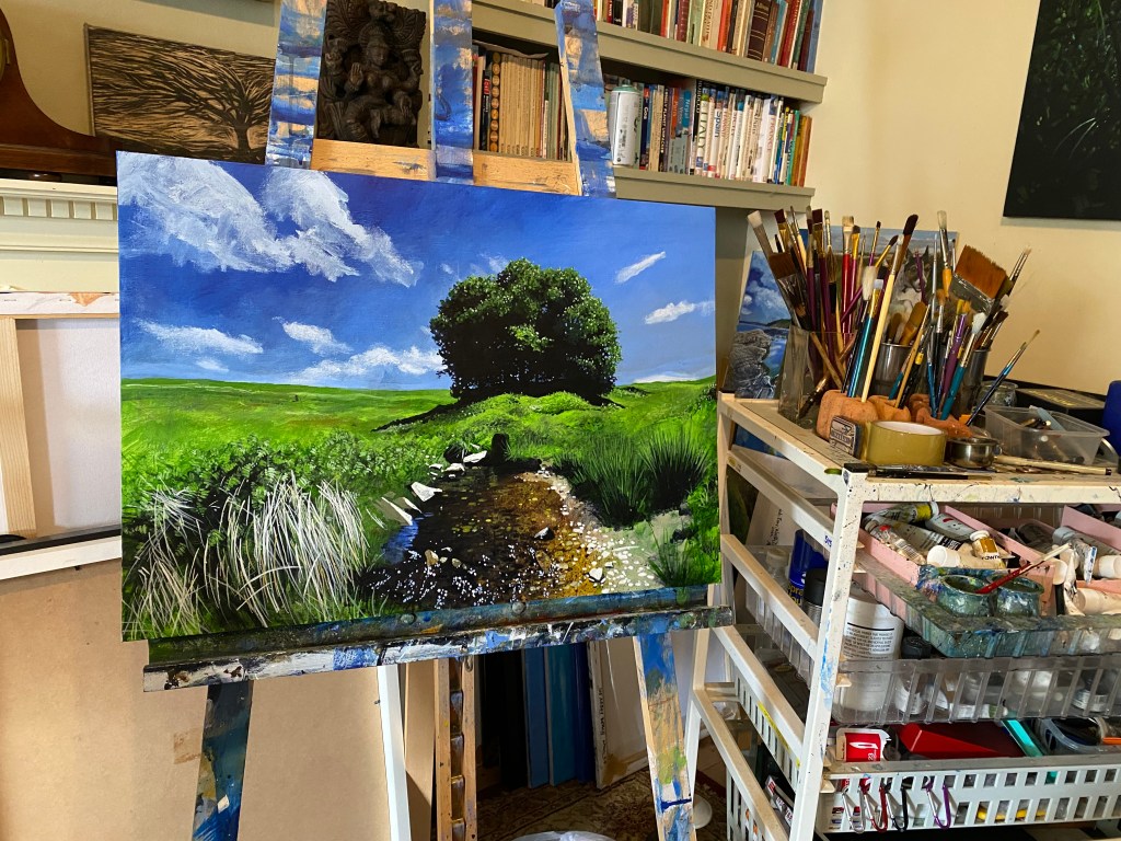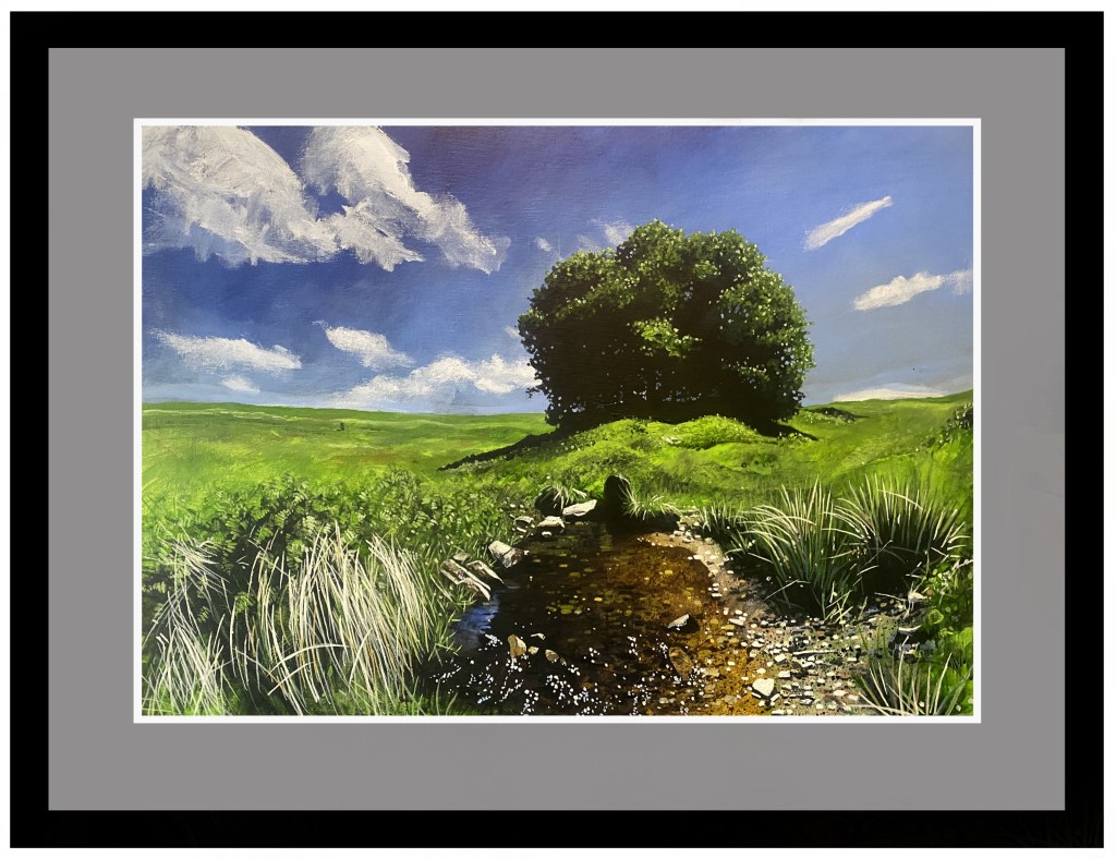 An acrylic painting of Three Combes Foot near Robber’s Bridge on Exmoor. I discovered a beech tree on the internet and thought it reminiscent of the famous Sycamore Gap in Northumberland. What I hadn’t realised it is actually a group of trees planted in a circle amid an ancient dry stone wall cattle enclosure. Within the shaded, inner sanctum, you experience a magical feeling of serenity, for me one of the secret highlights to be discovered on Exmoor. Al