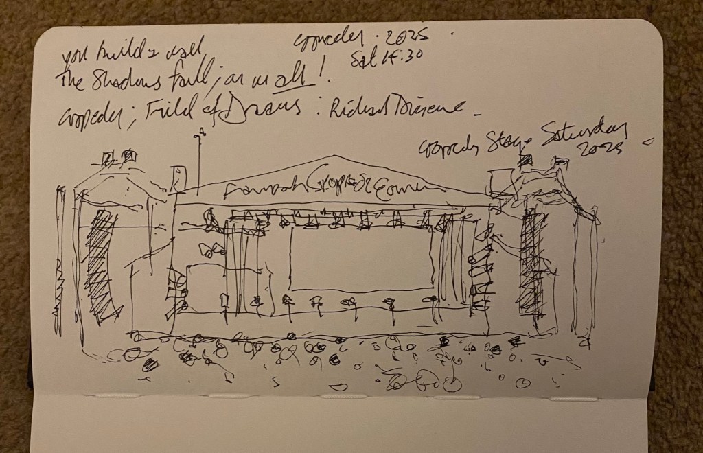 During this busy visit I managed to get in some time to do some pen and ink sketches. The canal tow path with lock man’s cottage is a particular favourite of mine at Cropredy. The other sketches are of the main arena and stage at the festival with its lights and speaker systems. It was great to see the Harvest Moon in the sky during the evening performances and a special appearance by the famous Robert Plant of Led Zeppelin.