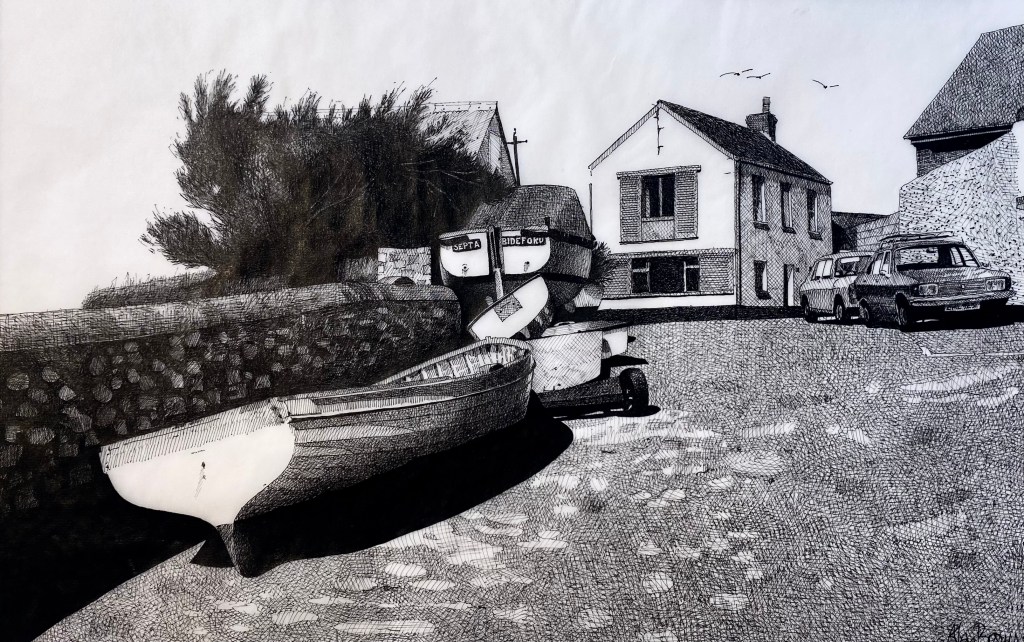 A view leading away from the RNLI Lifeboat Station in Appledore, North Devon. The pen & ink of mine on the left drawn thirty years ago vs the same scene today!