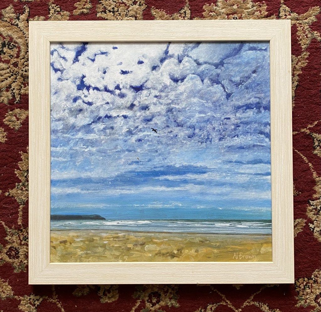 A painting of the wonderful beach bellow Lee Abbey in North Devon, 24 x 18″ canvas. We spent the day here in this quiet cove in the warm spring sunshine. It have a beautiful waterfall cascading as you enter the beach and the views out along the North Devon Coast are stunning. After we had a cream tea at the Abbey Tearooms!