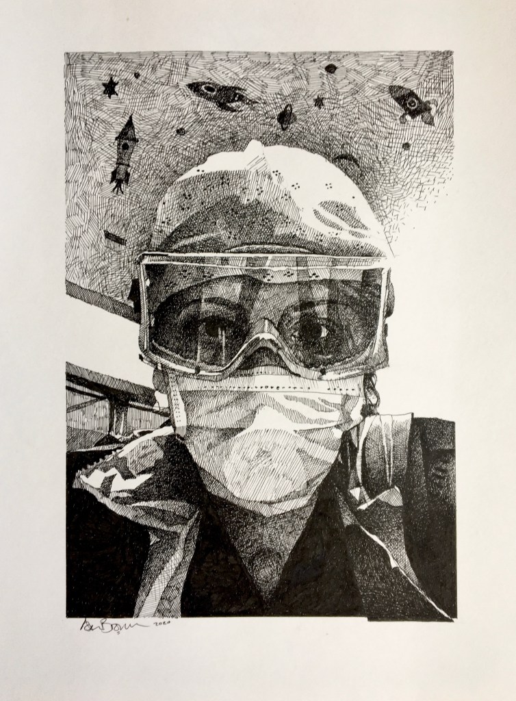 Presently I’m working on a series of sketches of some of my colleagues at North Devon District Hospital at Raleigh Park, Barnstaple. Pen and Ink on thick cartridge paper. So far I’ve drawn ODPs (Operating Department Pratitioners), a member of our Support Staff and Recovery Nurses. I’m also experimenting with Uni-Ball Needle Pens and the moment instead of my usual traditional knib or Staedtler fine draughting pens!