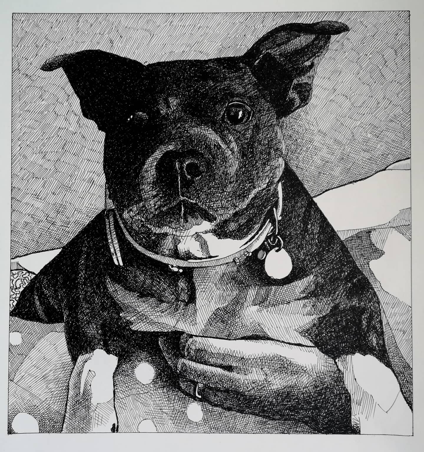I don’t usually paint or draw portraits of pets, let alone do commission work, but here is one of a friend’s Staffordshire Terrier in memorial. This has been completed using Pen and Ink, pencil and Uni-ball Pens. Below is an acrylic of another friend’s Jack Russell painted some years ago.