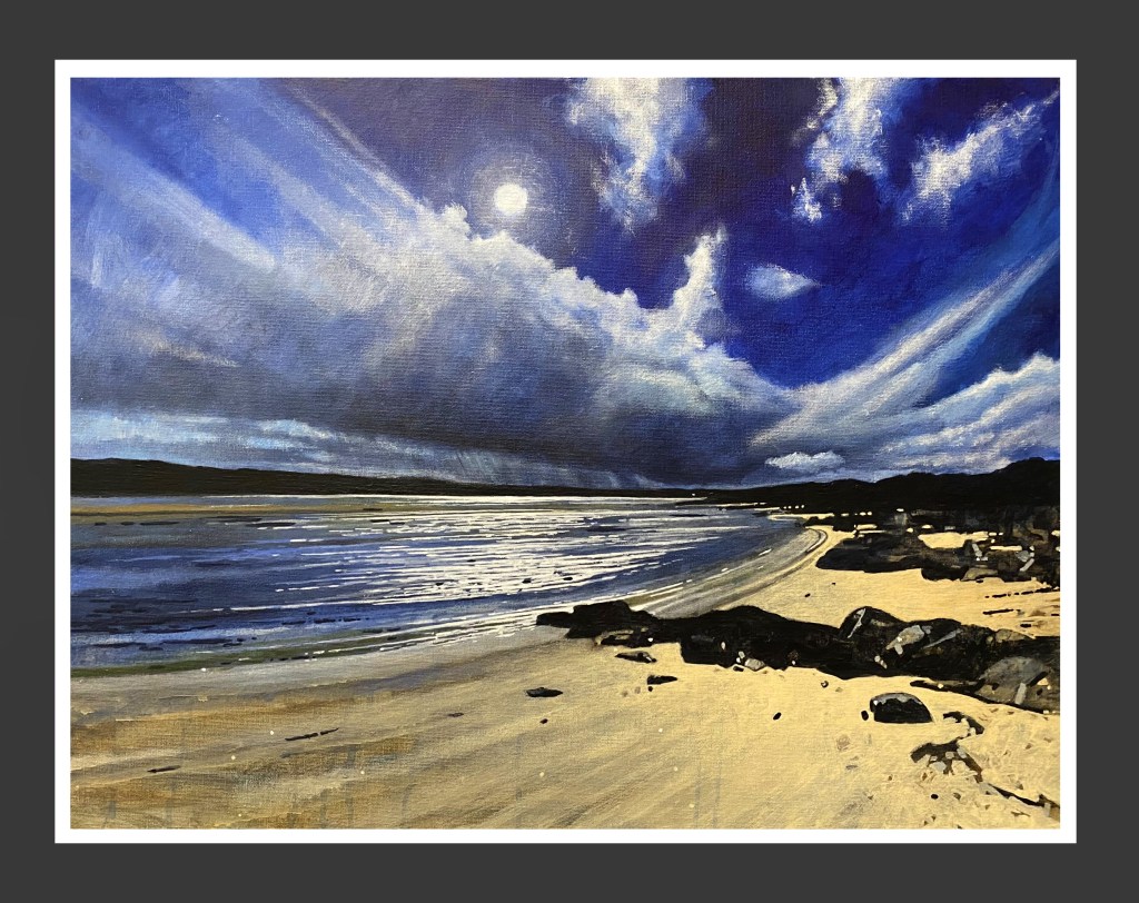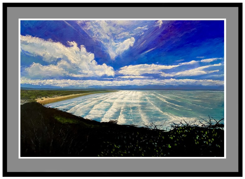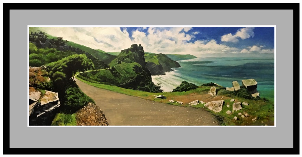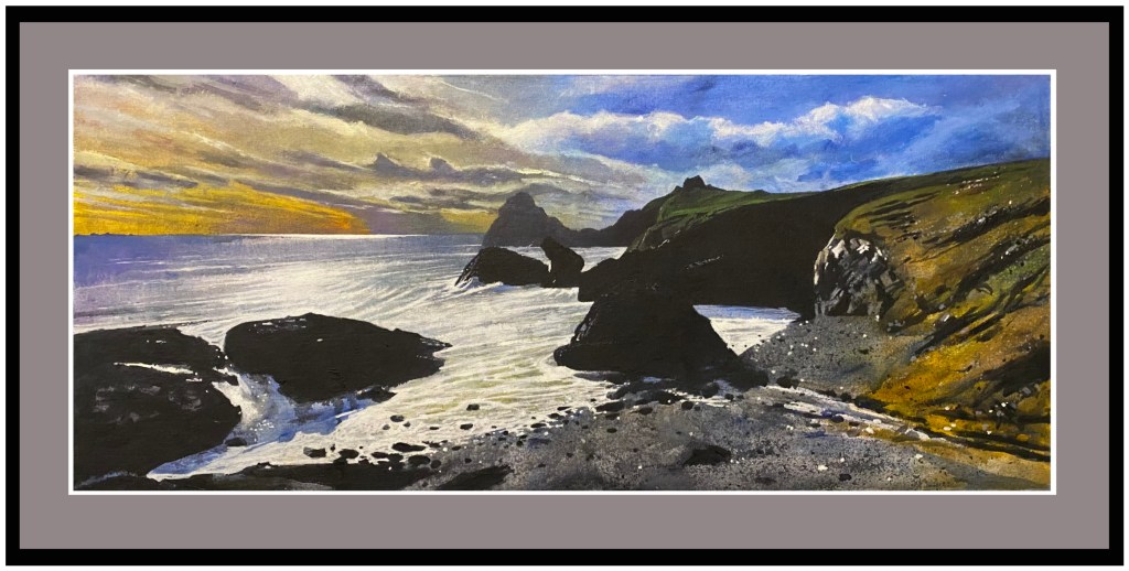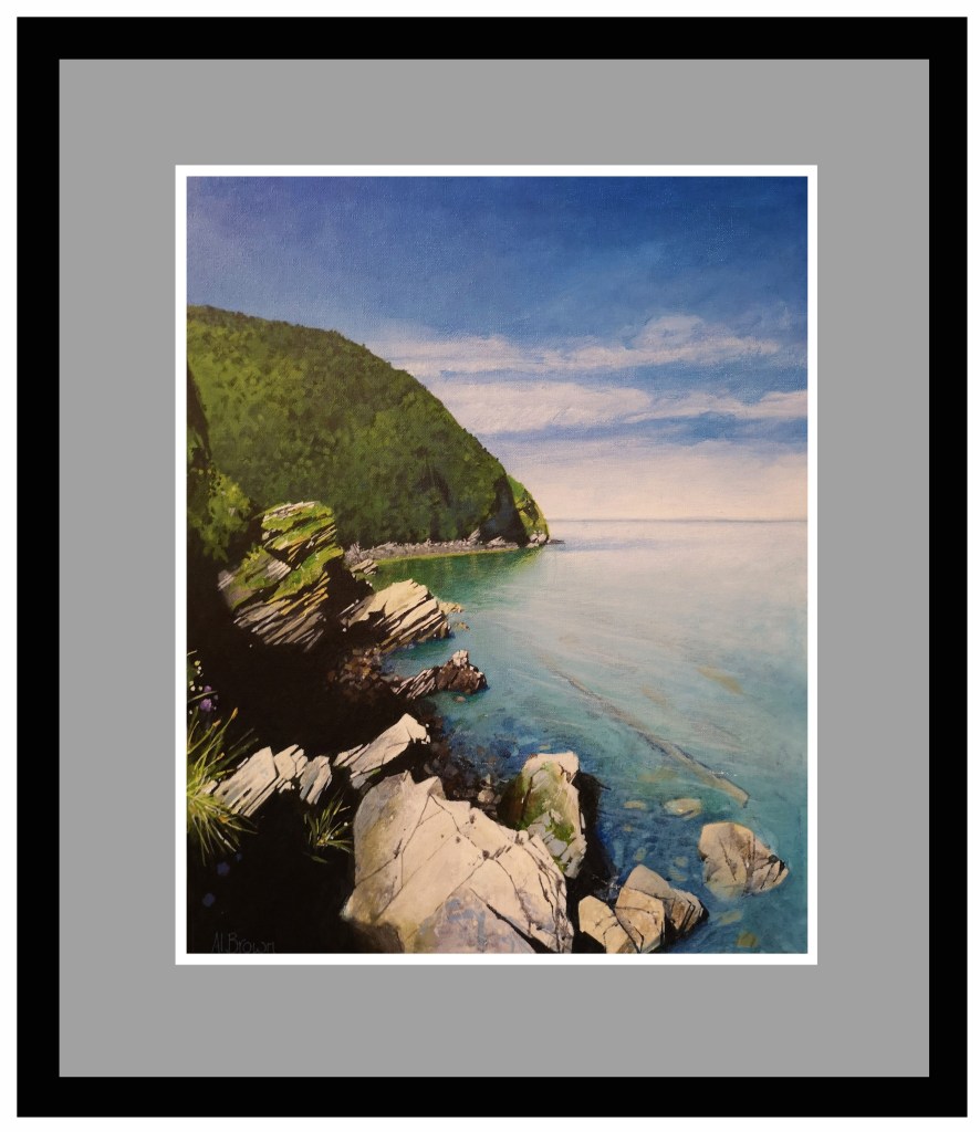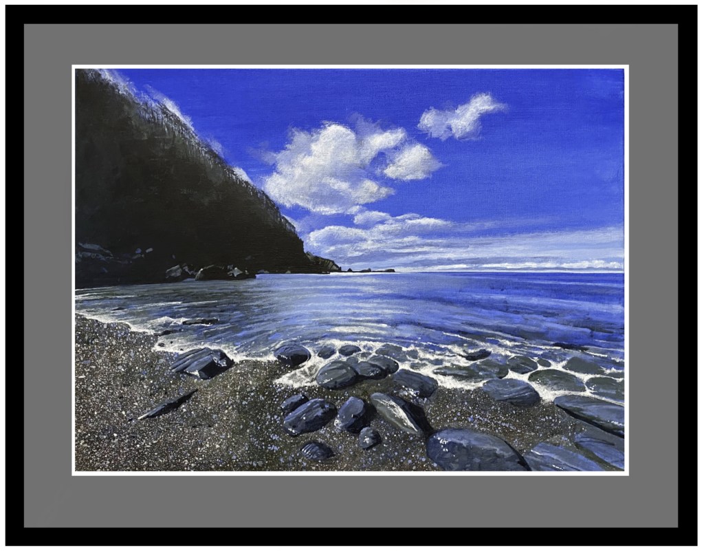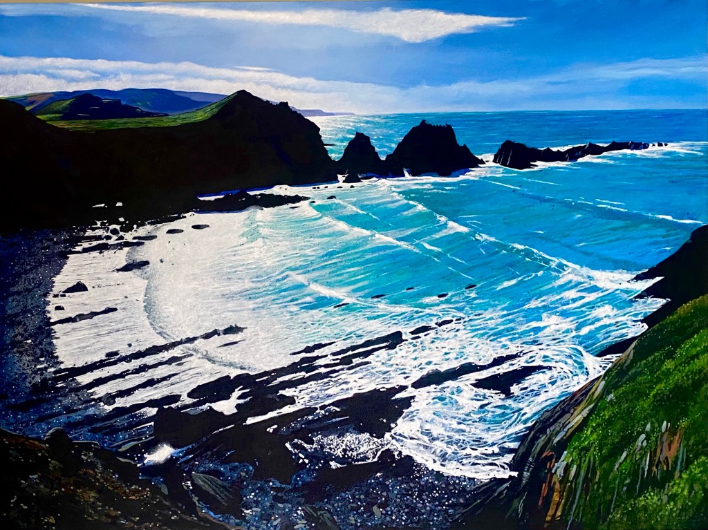 A painting of ‘The Happiest View In England’’ acrylic on 24 x 32” canvas. A secret hidden beach in North Devon.
