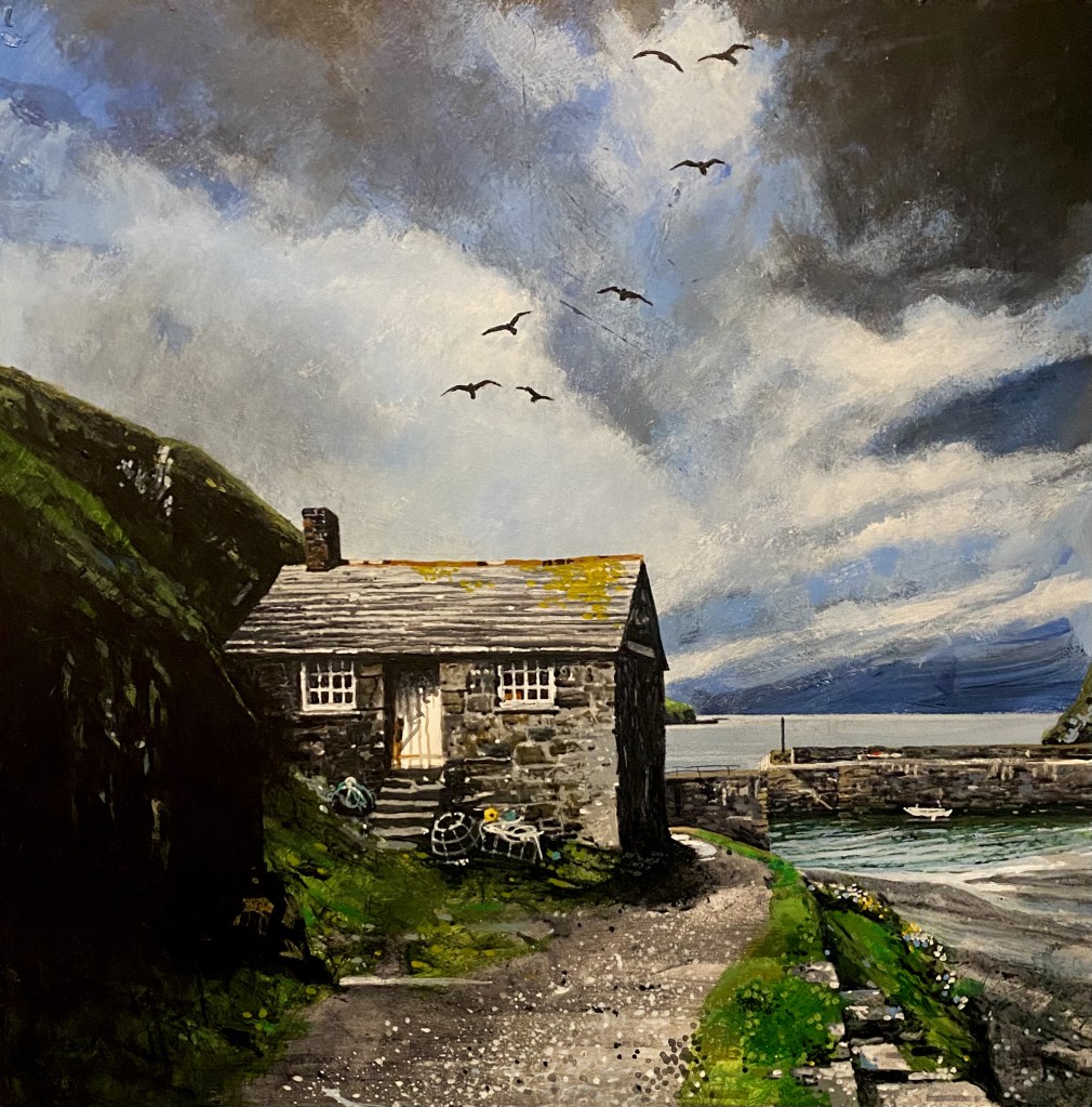 An acrylic painting on gesso panel 380 x 380mm of the famous hut in Mullion Harbour, Cornwall. My wife and I often stay in Mullion and use it as a base to visit the sights of The Lizard!
