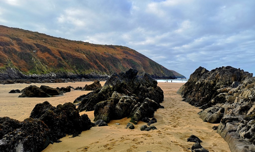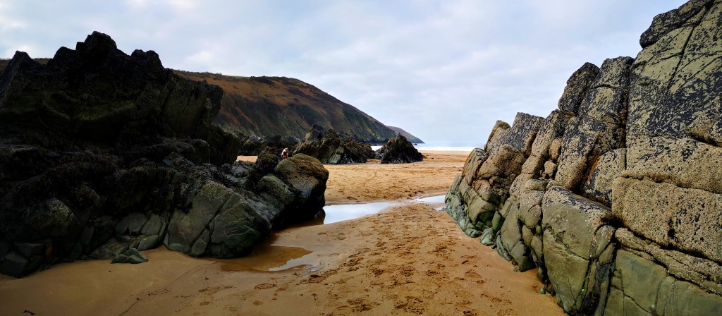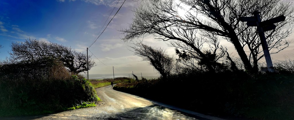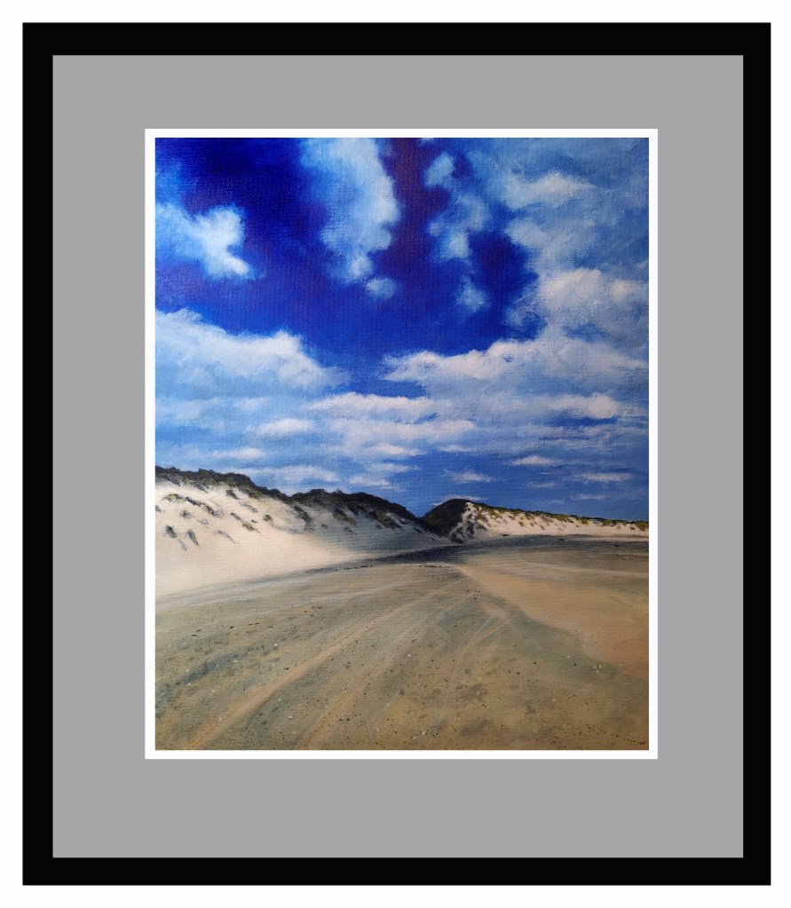 At the end of the beach boardwalk heading towards the Crow Point Carpark there is a a little pond of brackish water on the left. It is here where the brightly coloured damsel and dragon flies hover during the warm spring and summer. With this painting I’m trying to capture that Tulgey Wood sense of dark foreboding. I’ve also made a dark brushstroke across the sky to hint at a starling murmuration. This composition is in Bideford Black on thick cartridge paper, with some scraping and pigment removal.