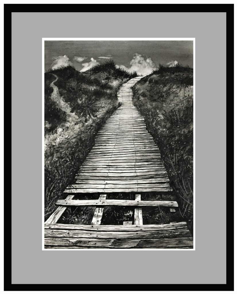 Another painting in Bideford Black paint with some added sgraffito, picture size 610 x 440mm on Bockingford paper. This was painted after a visit to Crow Point in North Devon. After driving along a toll road you park and walk along this boardwalk to the point where you usually get the beach to yourself. This beach gives you wonderful views of Instow, Appledore and Westward Ho due to its position at the entrance to both Torridge and Taw Estuaries. Spend many happy times here building driftwood fires and watching the sunsets. Al