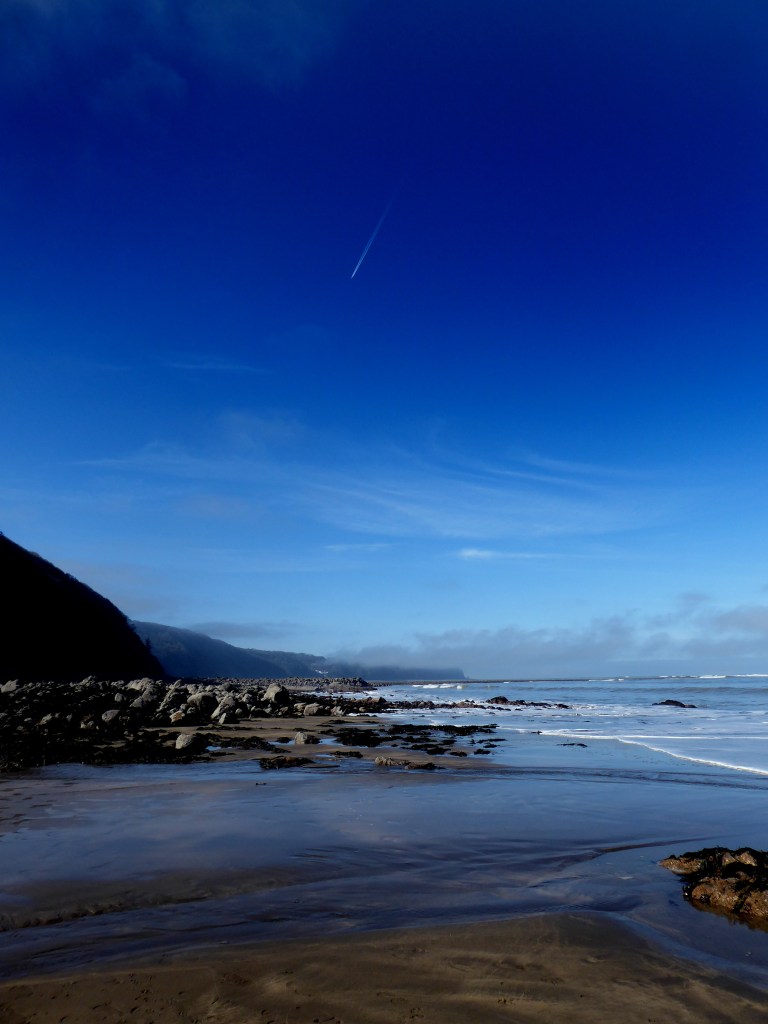 This acrylic painting is now completed 24 x 30″. I started this composition by using an ultramarine acrylic spray to create an almost uniform blue base colour. I’ve then gradually dry brushed layer after layer to create some 3D depth to the sky. I’m now using some watered down paint to blow in the sea, waves and foreground, then using my favourite Payne’s Grey I’ve accented some depth to the pebbles. I must say I like the vapor trail of the plane on it’s way out to sea. During the pandemic the amount of flights have dropped and this has been evident in our North Devon skies.