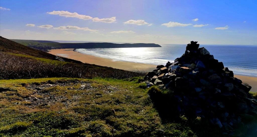 What a wonderful day with my wife Donna searching secret North Devon Beaches for sea glass. Donna is returning to jewellery making using washed up colourful nylon line and sea glass. We spent the latter half of the afternoon on Barricane Beach where the beach café has recently been dropped in by crane. Here during the day you can get tea, cream teas etc but in the evening they serve Sri Lankan veg and chicken curries to the masses. This beach used to be a local secret but sadly no more so it was lovely to have it to ourselves today! Finally I parked at Marine Drive carpark and walked up the steep Potter’s Hill to the cairn at the top. From here you can marvel at the panoramic view out over Woolacombe down to Putsborough Beach.