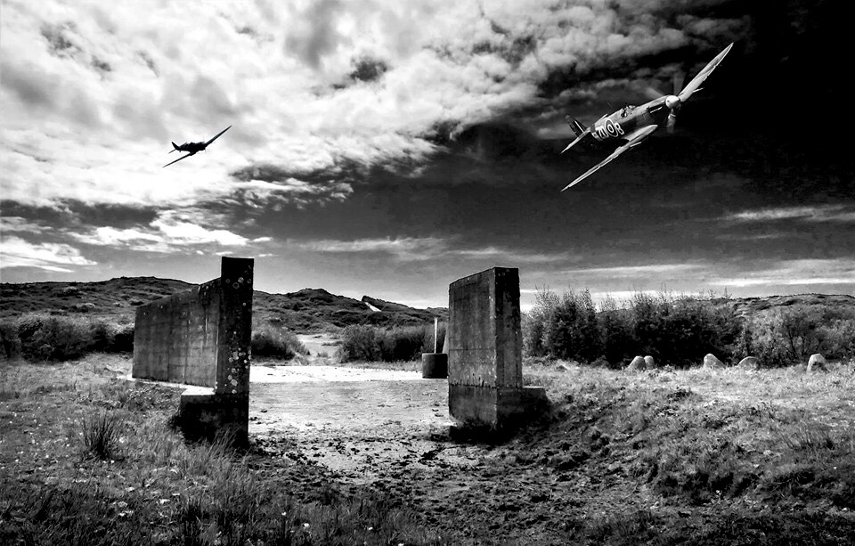 This is my version inspired by Buckham’s work of Spitfires over the US Assault Training Centre concrete landing craft on Braunton Burrows. These concrete structures, were laid during the World War 2 by the Americans when practising for the D Day Landings on Omaha and Utah by 146th Eng, Co C, 1st Platoon. Al