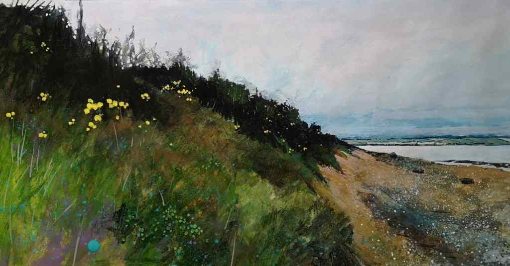 I attended an interesting walk and talk arranged by the Braunton Countryside Centre about the Second World War and the Burrows. I sketched a quick picture of the waterside as I’ve never seen so many Evening Primrose plants in flower. Quite an unusual light this morning quite humid, it reminded me of that Monsoon type light. I was amazed at the amount of Evening Primrose in bloom, the flowers looked even brighter against the dark sky.