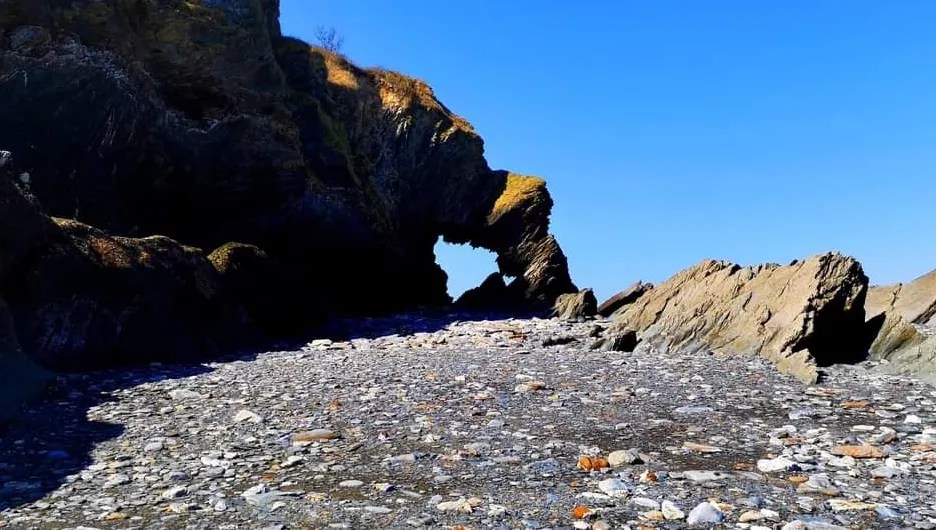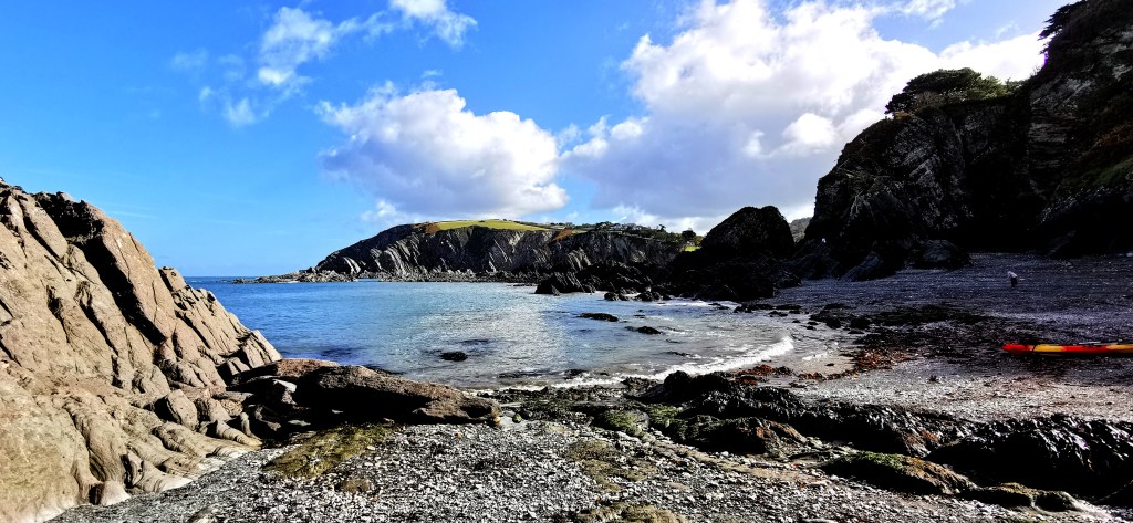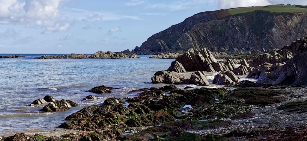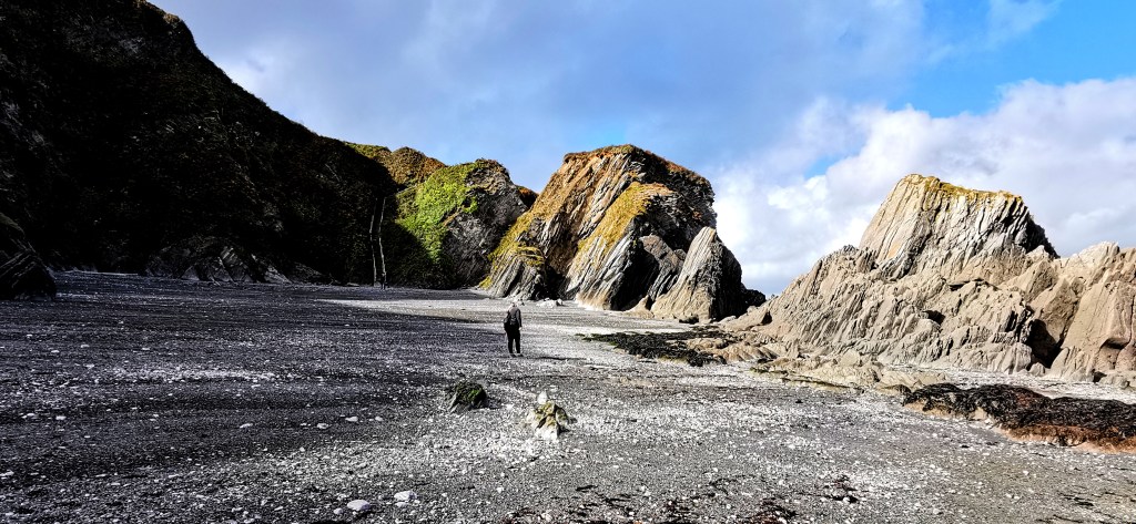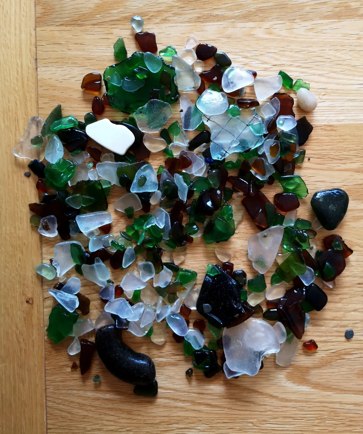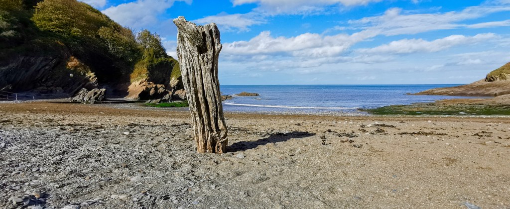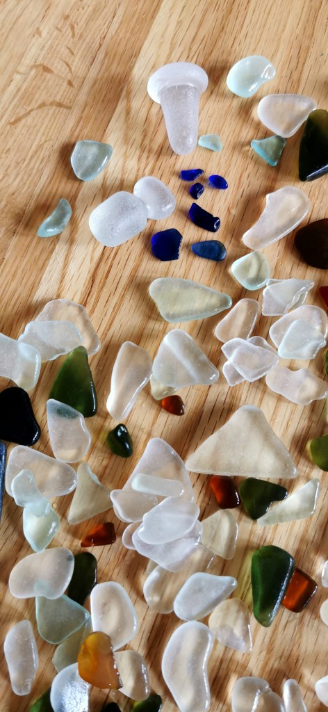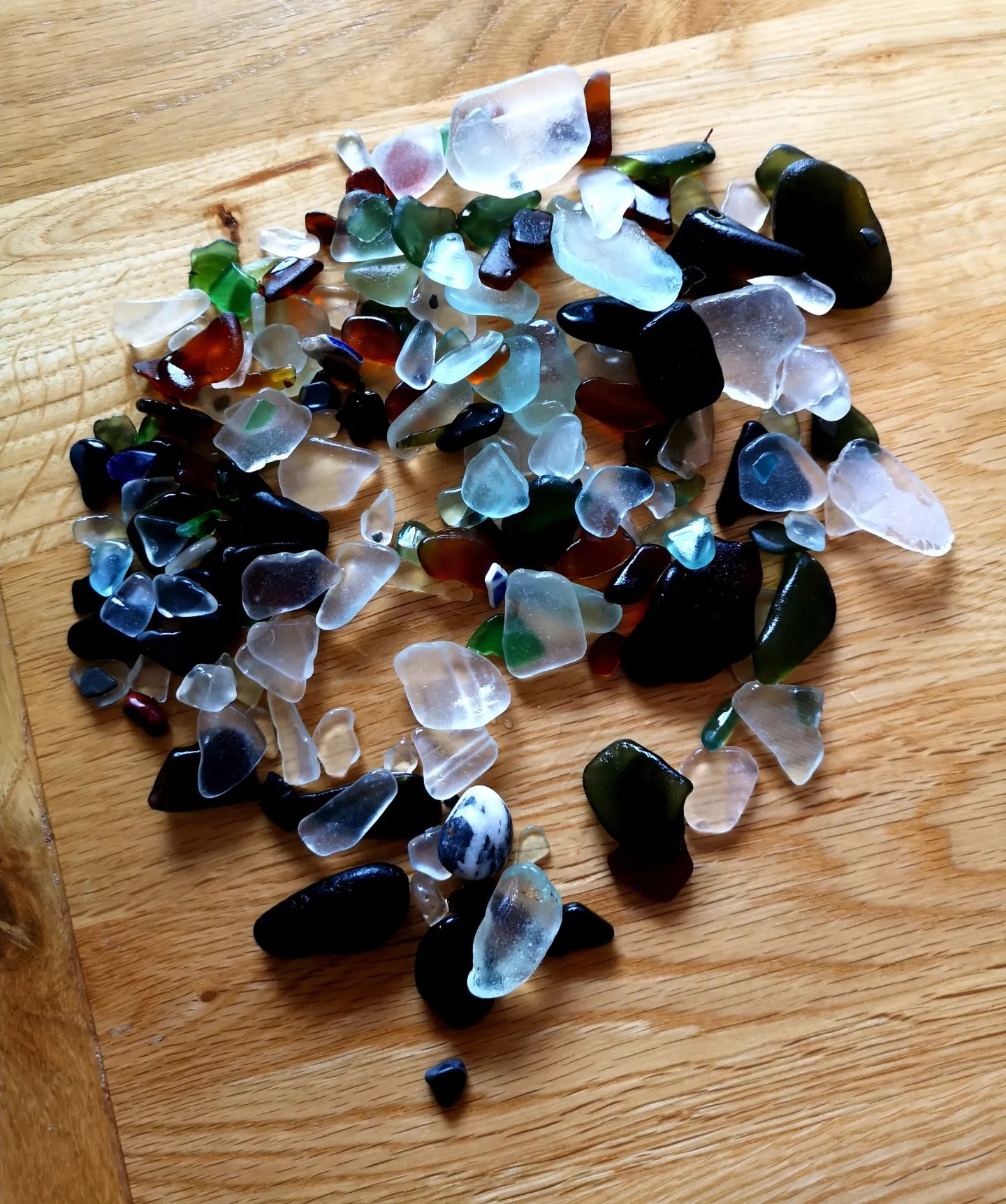 It seems that a return to glass hunting on Hele Beach was in order today and although the tide was fully in we thought it possible to search the sands whilst the tide ebbed. We arrived, parked in the fee carpark and walked onto the beach, the tide was dropping quickly revealing shining wet stones and glass. It’s quite odd how searching in one direction you see no glass yet you can turn around and see everything, we believe it’s all in the angle of the reflective light and the wetness of the glass. You also have to crouch down quite close to the sand as sea glass fully reveals itself to only those who search intimately.
