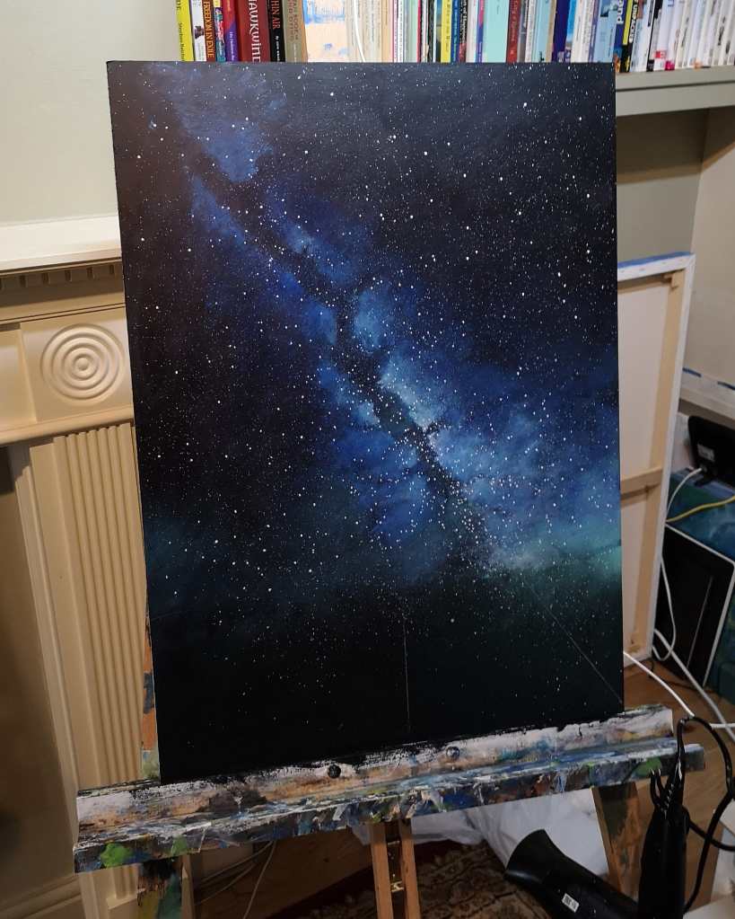 This acrylic painting is now completed 24 x 30″. I started this composition by using an ultramarine acrylic spray to create an almost uniform blue base colour. I’ve then gradually dry brushed layer after layer to create some 3D depth to the sky. I’m now using some watered down paint to blow in the sea, waves and foreground, then using my favourite Payne’s Grey I’ve accented some depth to the pebbles. I must say I like the vapor trail of the plane on it’s way out to sea. During the pandemic the amount of flights have dropped and this has been evident in our North Devon skies.
