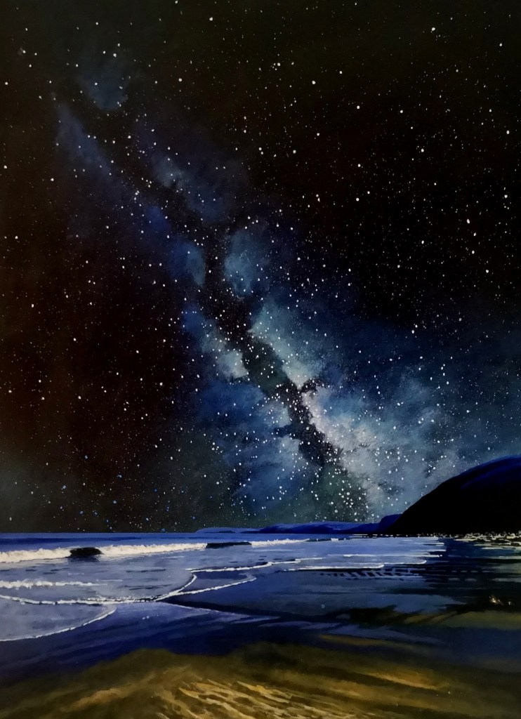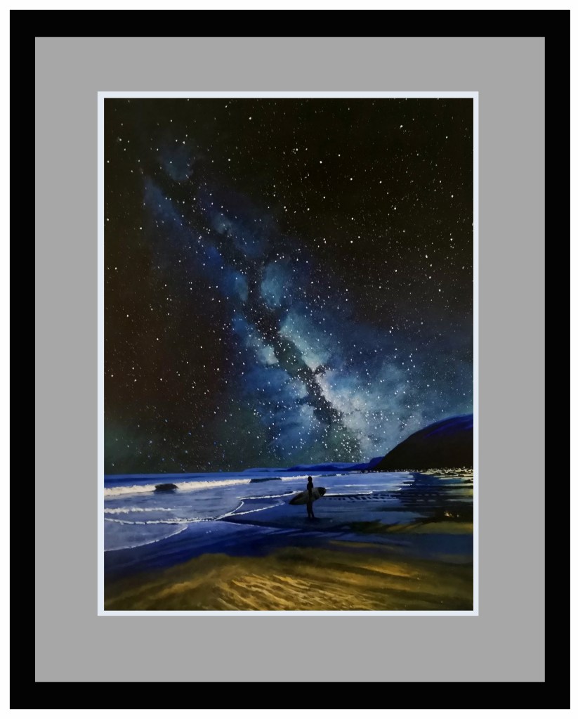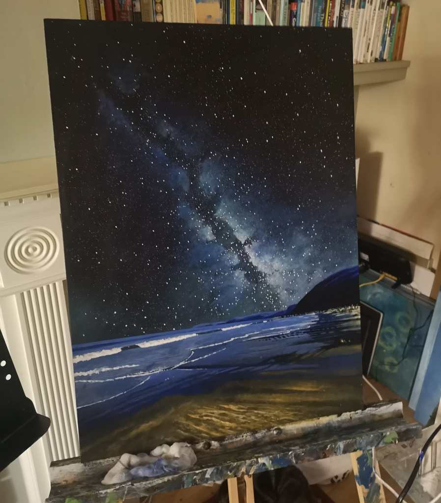 It’s been a while, due to lack of unfolding confidence issues since I last painted, but here goes to get me out of my present artistic fog! This is a picture of Bucks Mills in North Devon with someone surfing at night making the most of a full moon’s light. 😉