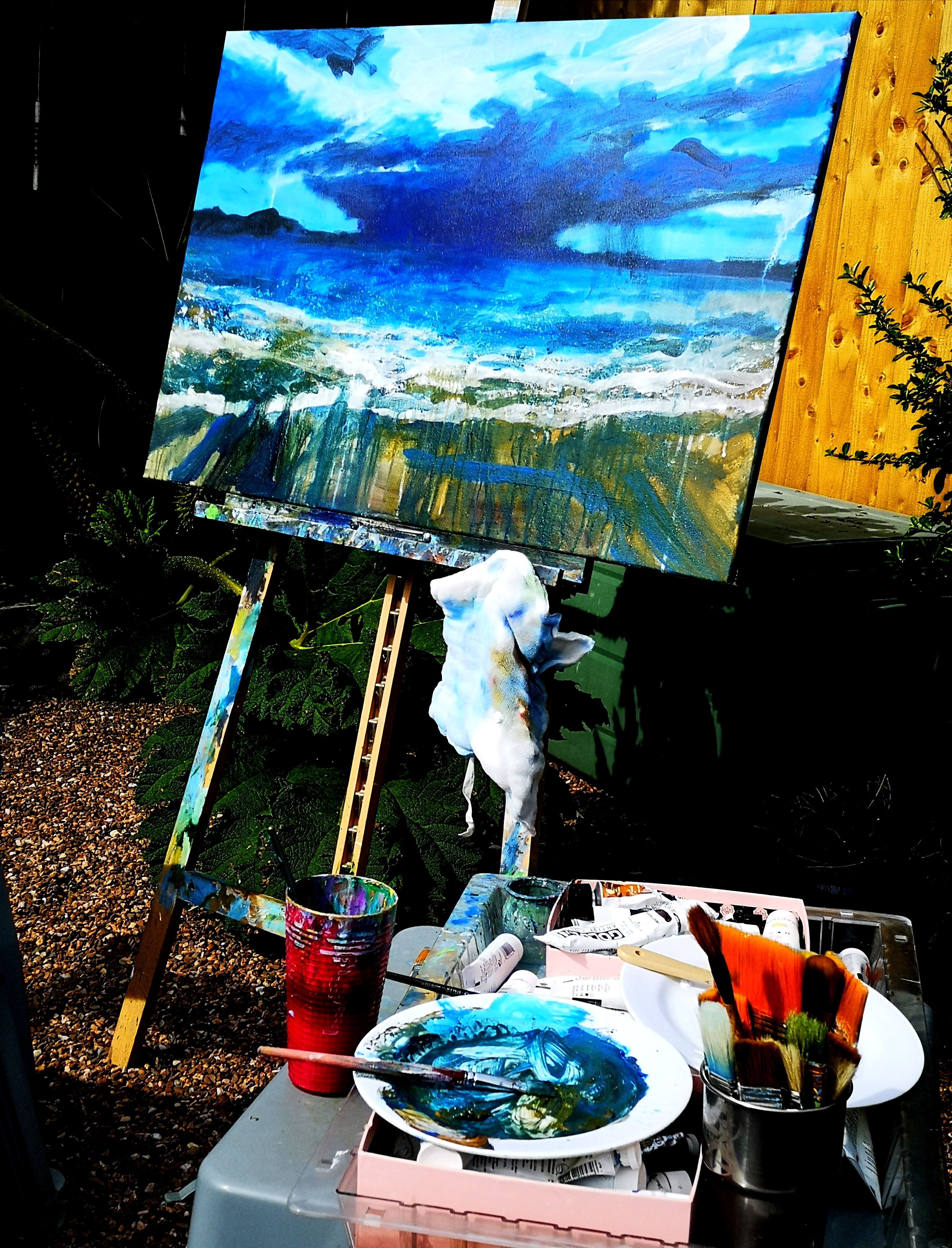 An hour of getting rid of the blank white canvas and laying out the basic tones and colours for this painting. It’s been quite a while, for various reasons, since I daubed paint on canvas so this initial start should commit me to action. We loved our stay here a few weeks ago and the coastline along this particular part of the Cornish coast is stunning. I sat sketching the sea from ontop a cliff here and watched a sailing ship weight anchor and it’s small boat venture into Mullion Harbour over the crystal clear turquoise water. The final acrylic painting is 24 x 30″ on canvas please note that the colours are not as the original painting! Al