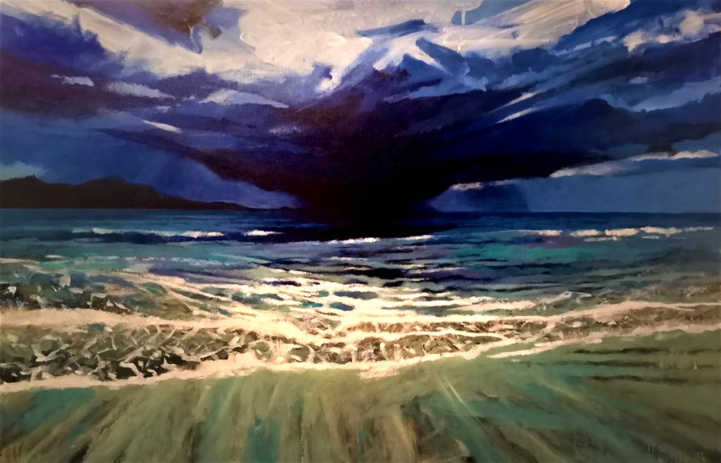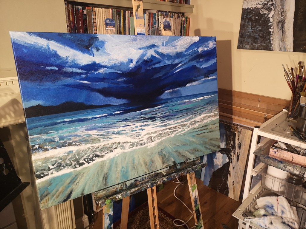 This painting is inspired by a walk around the Lizard Peninsula from Church Cove around the Lizard to Kynance. It was quite an overcast day and when I arrived at Kynance Cove I walked along the quiet beach admiring the wonderful view. Immediately a massive rainstorm approached and I took cover from the rain in one of the caves there. When the storm had passed over out came the sunshine and the beach was illuminated with an earie neon light. Looking out along the coast this storm had already engulfed The Lizard in it’s dark focused cloud. Oddly it looked somewhat like an atomic bomb explosion, I was taken by how the white of the water’s edge looked against the dark foreboding background. This image was originally taken on my mobile phone, and now an acrylic on 900 x 600mm canvas.