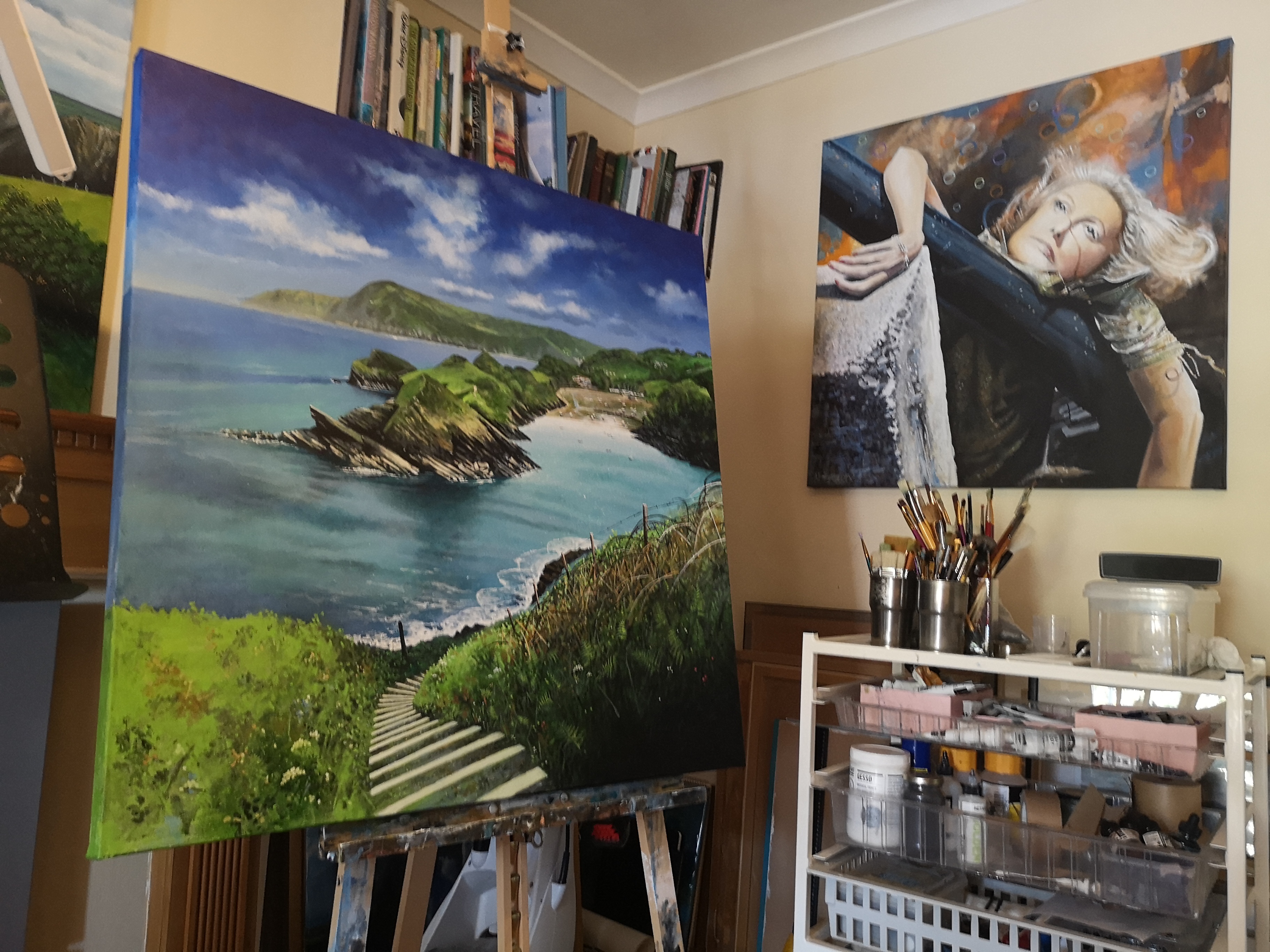This painting is of Broadsands Beach in North Devon as you would see it, out across the water from Watermouth Cove, 900 x 600mm acrylic on canvas. There is a marvellous view out over Broadsands from the top of the hill on the right of this painting which is called, as previously posted and mentioned, The Happiest View In Britain. Below is a view of my present workspace with an old discarded, yet rather useful anaesthetic drug rack which is used as a base for painting, thanks to my colleagues at work. There you will also see the progression to the competed composition. This will be the very last detailed acrylic of this kind as I’m moving forward with experimentation, and a fresher more immediate approach. I quite like the initial tonal shades of this painting and the temptation for me is just to leave it as it is, but I decided to ruin the freshness with some detailed brush work. Al