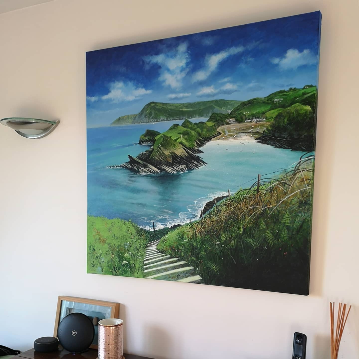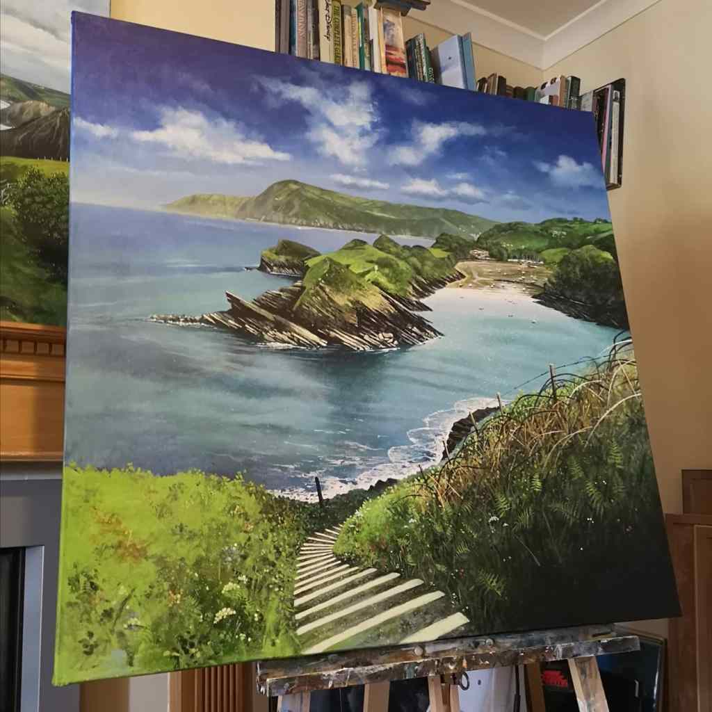 An acrylic on 32 x 24” canvas of a spectacular cove near Combe Martin in North Devon. It has been referred to by many as, ‘The Happiest View In Britain.’ Sadly the very steep cliff path down to the beach has subsided so access at the moment is by water only.