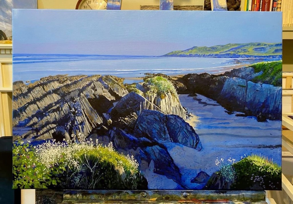 Whilst staying at The Watersmeet Hotel with my late wife I decided to take an early walk along the coast. This is a painting of Barricane with the early summer sunlight just catching the rocks! ❤️